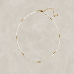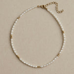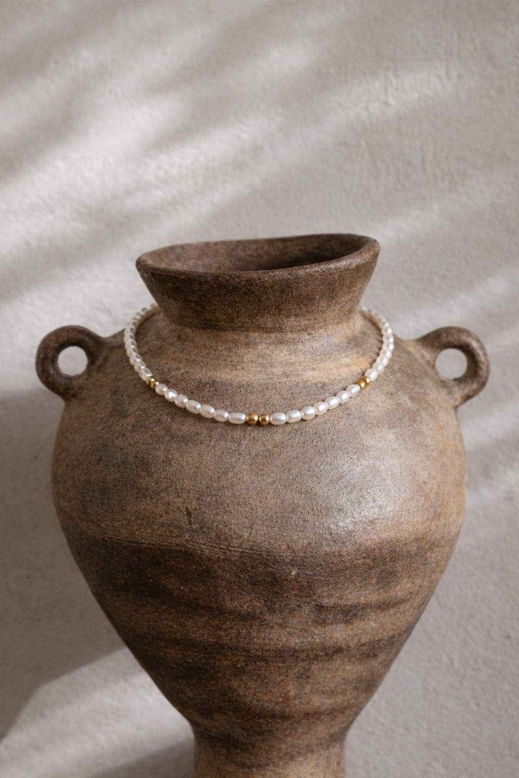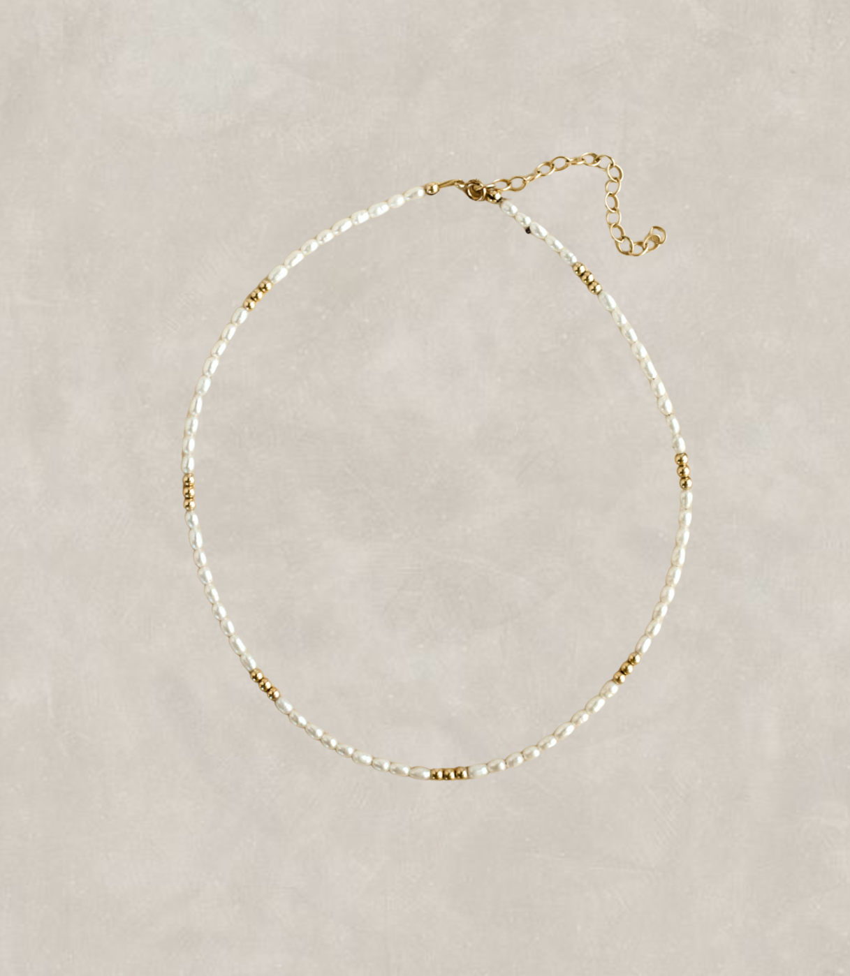 A fun mix of tiny freshwater rice pearls and gold filled or sterling silver beads strung on sterling silver- or gold-plated wire, finished with 3" chain extender to ensure the perfect fit.