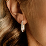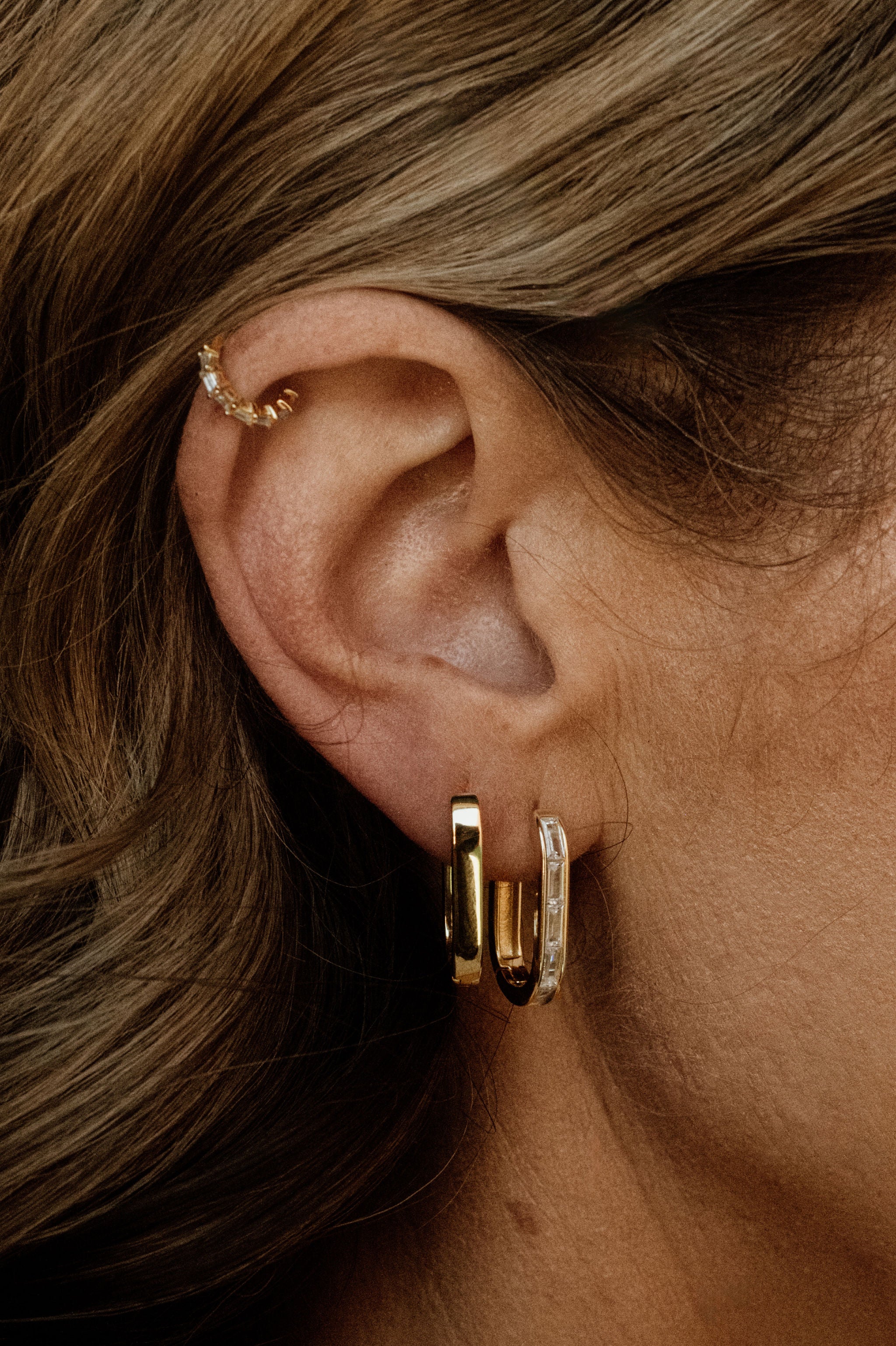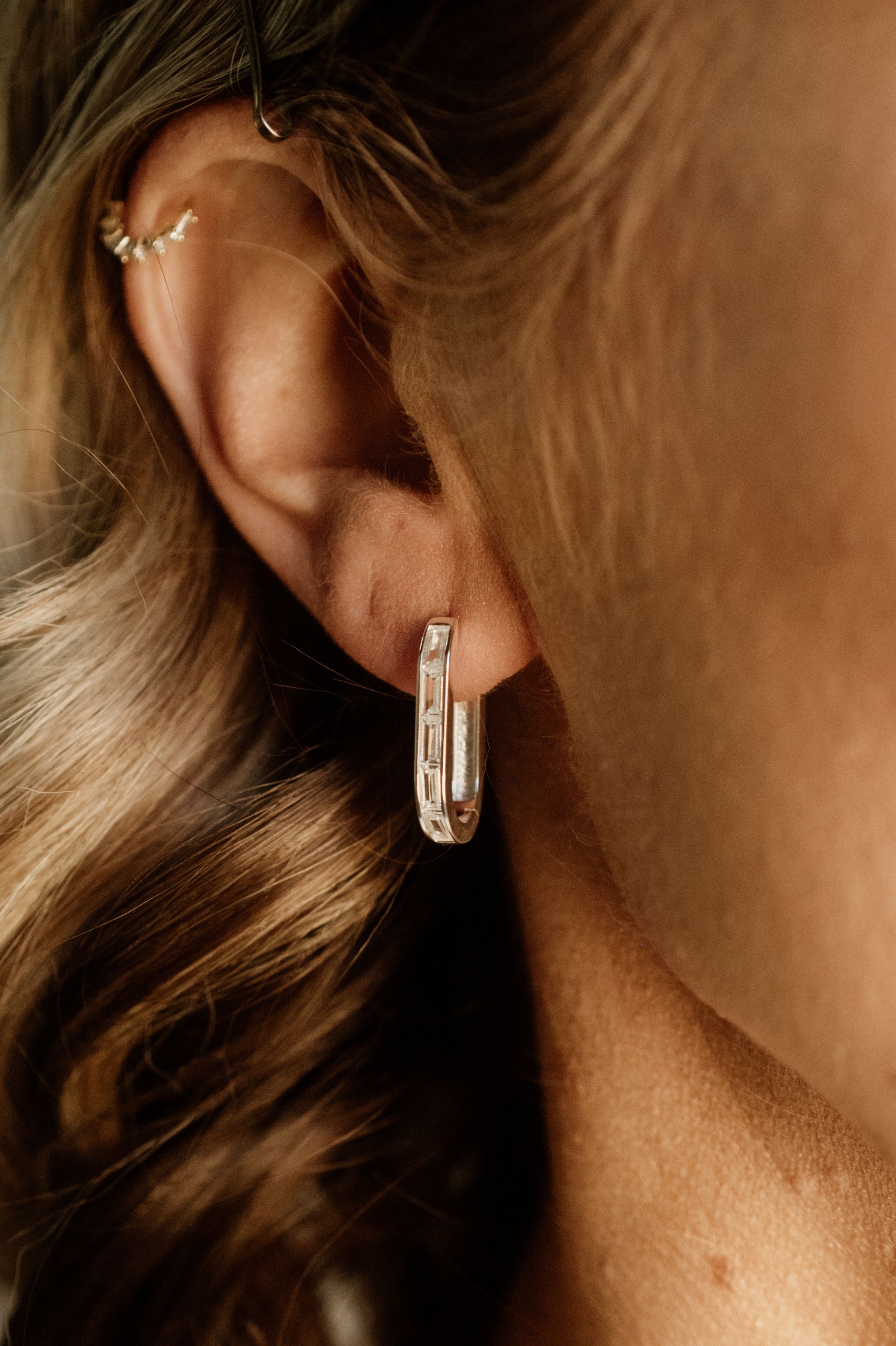 Elevate your accessory game with the ALBY Rectangle Hoop Earrings. Designed with a contemporary flair, these hoops showcase a stunning row of baguette CZ set in a sleek 14k gold plated (1 micron on sterling silver base) or sterling silver, frame. Their unique shape and luxurious shine make them ideal for both casual outings and formal events.