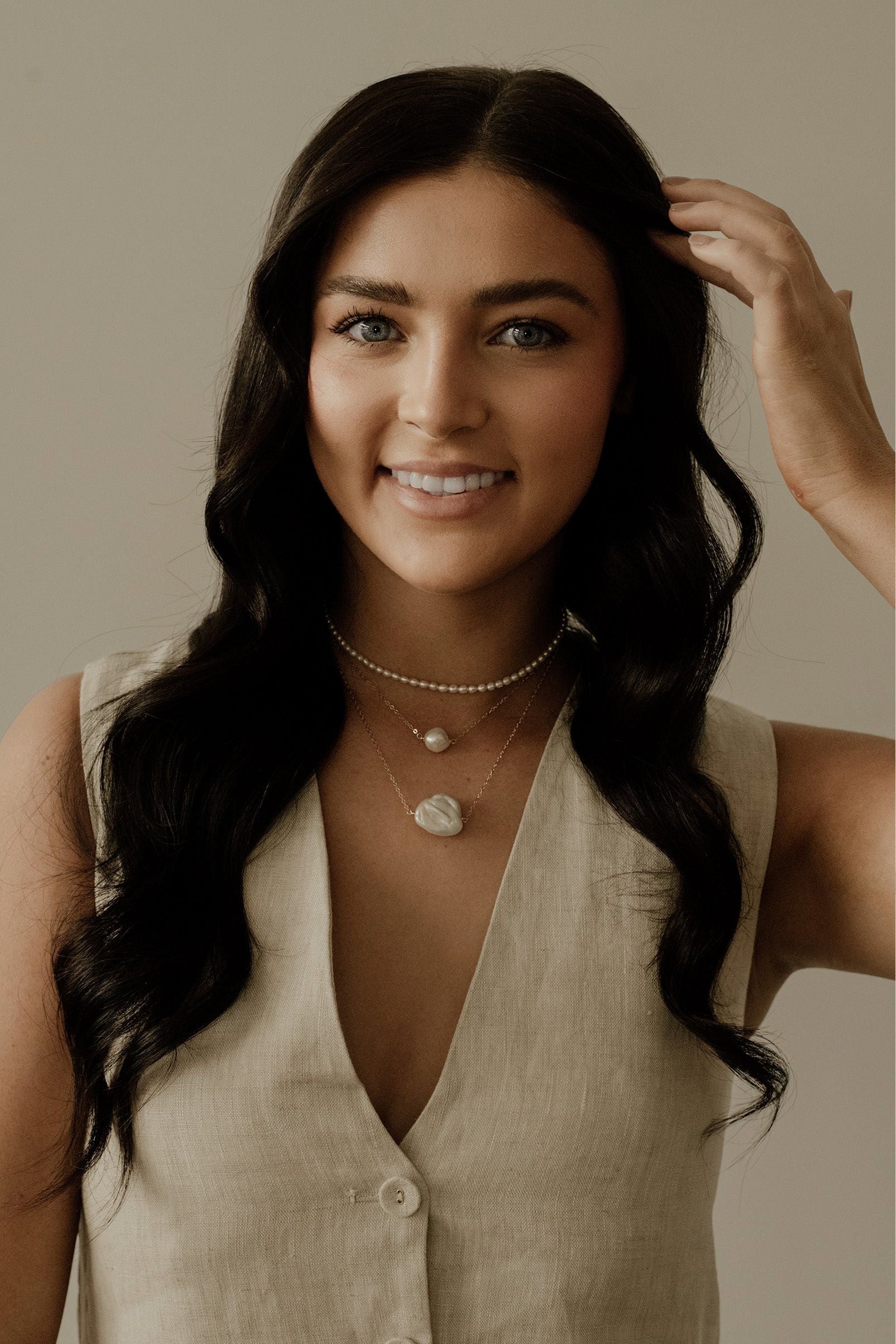 1.2mm cable chain in your choice of sterling silver or 148k gold vermeil featuring a small - medium freshwater Keshi pearl drop or floated. Available in 14” with 2" extender. Match with Ivy to complete the look.
