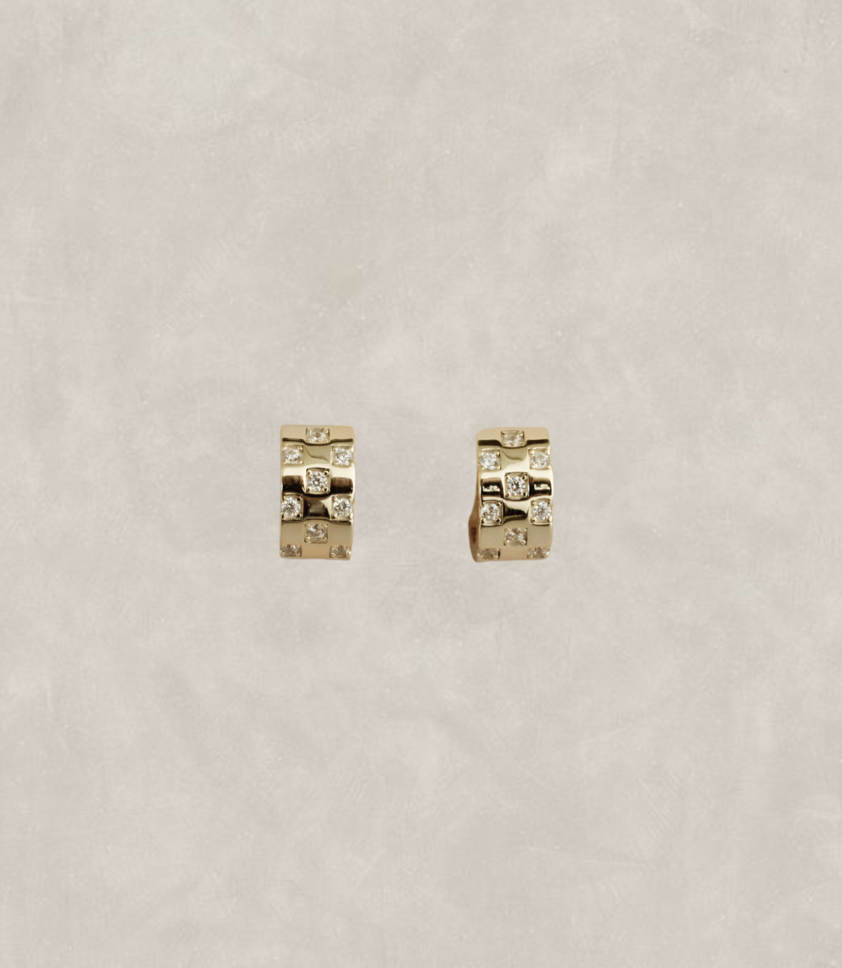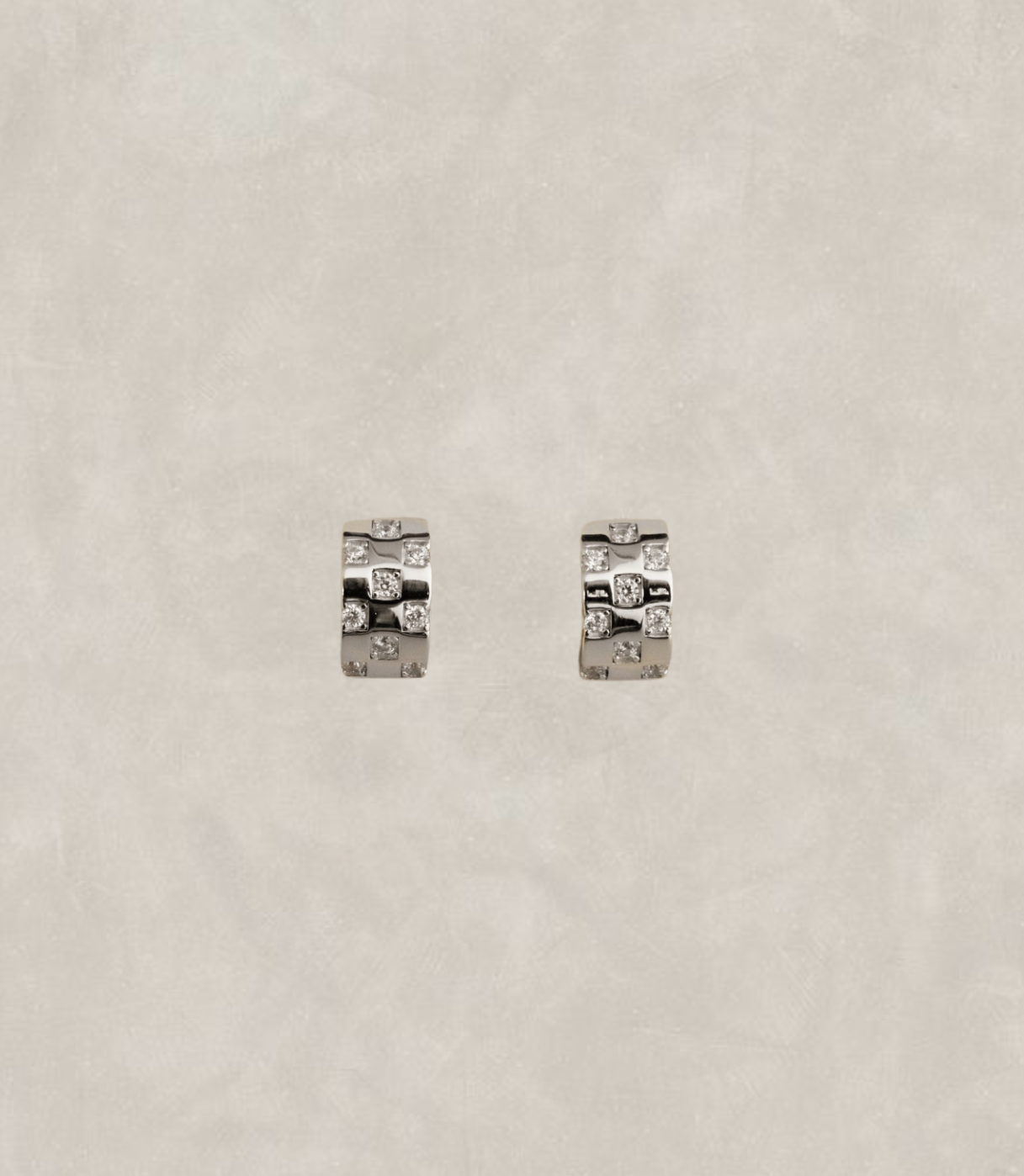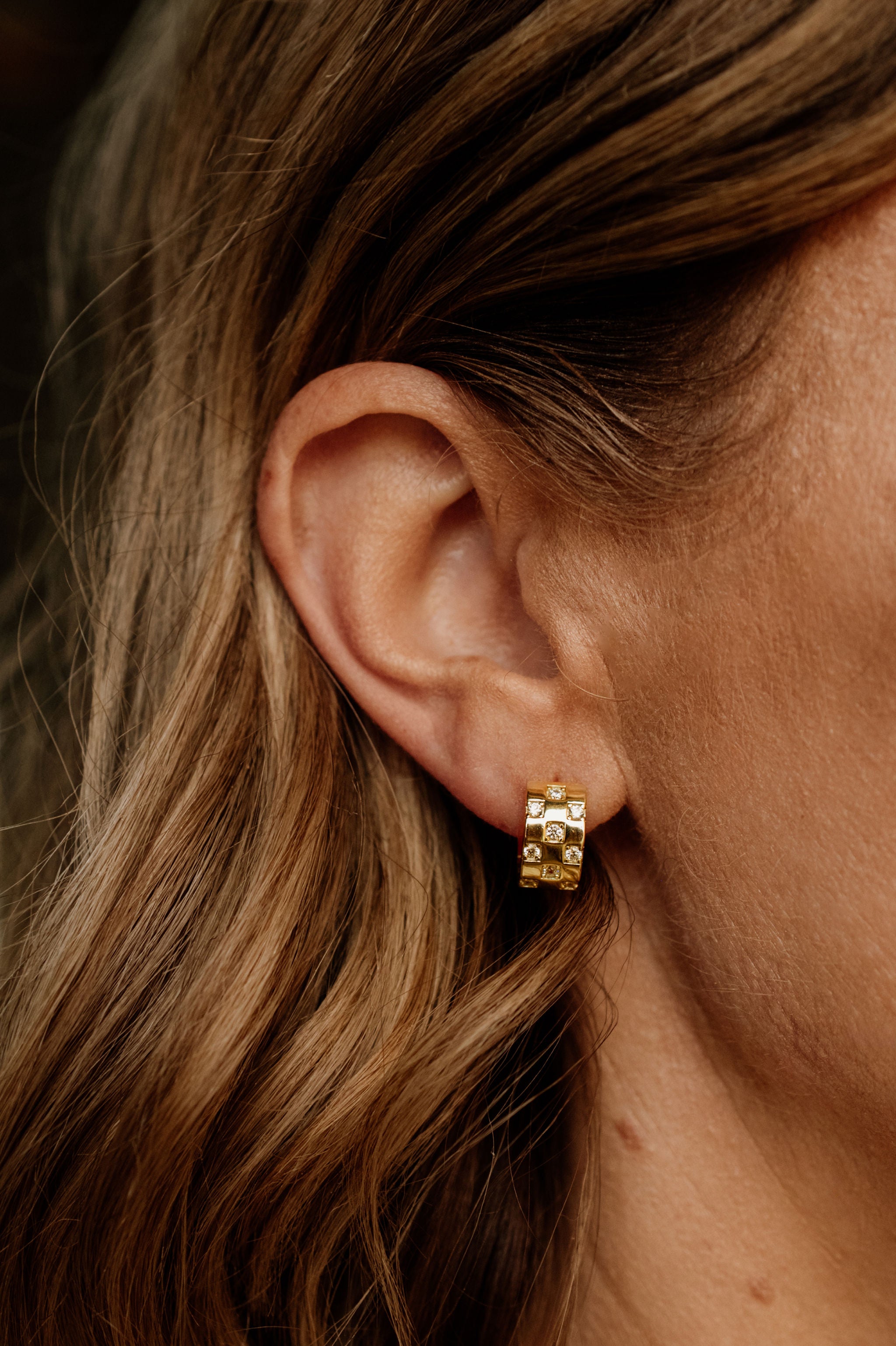 Elevate your accessory game with our stunning Diana Checkerboard Hoop Earrings. Crafted from premium metals, these earrings feature a unique checkerboard design adorned with shimmering cubic zirconia stones that catch the light with every movement.