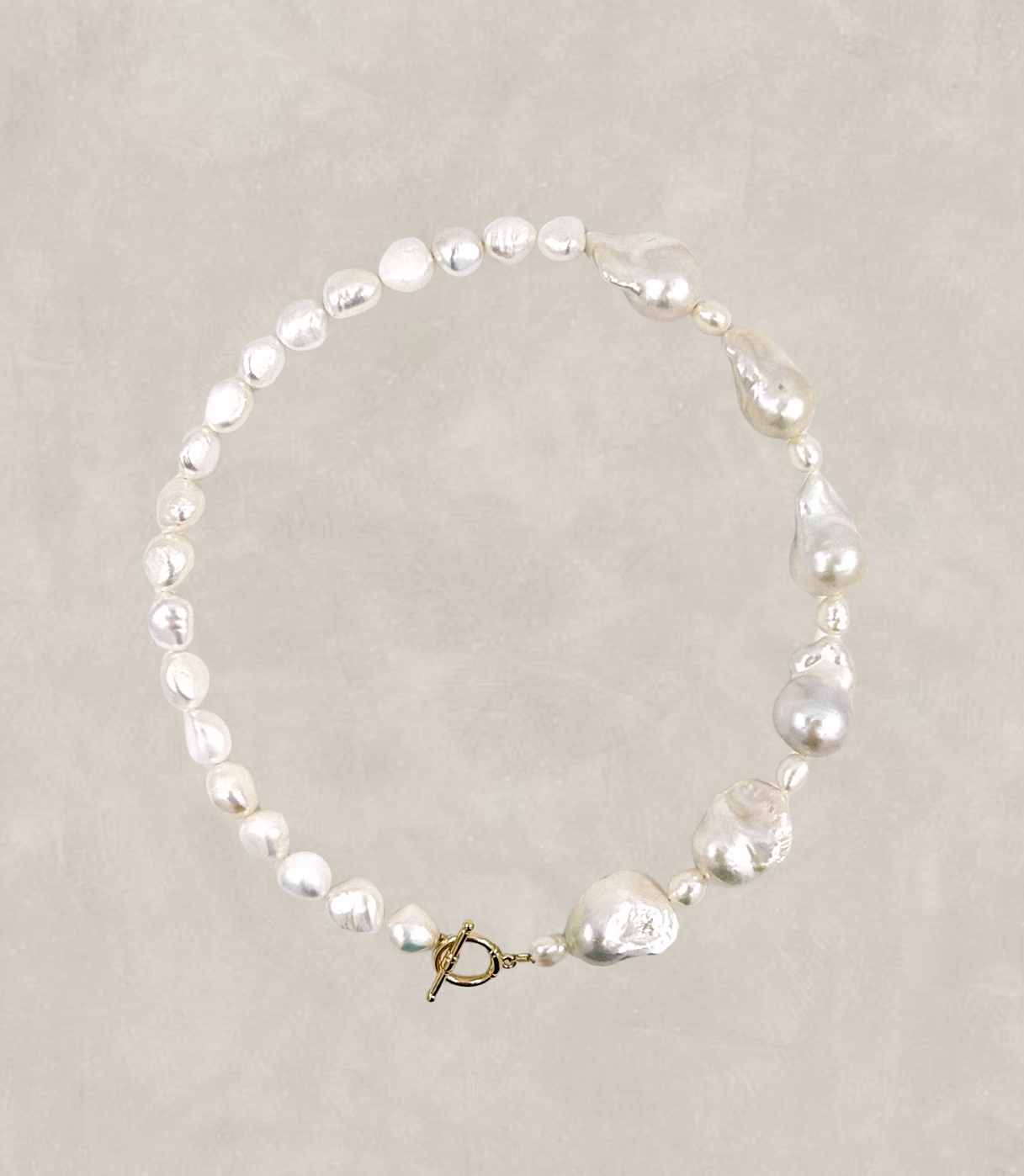 Elevate your style with our Lainey Pearl Necklace, crafted to offer a timeless sophistication to any ensemble. The lustrous pearls are carefully chosen for their unique shapes, creating a natural and refined look.