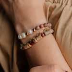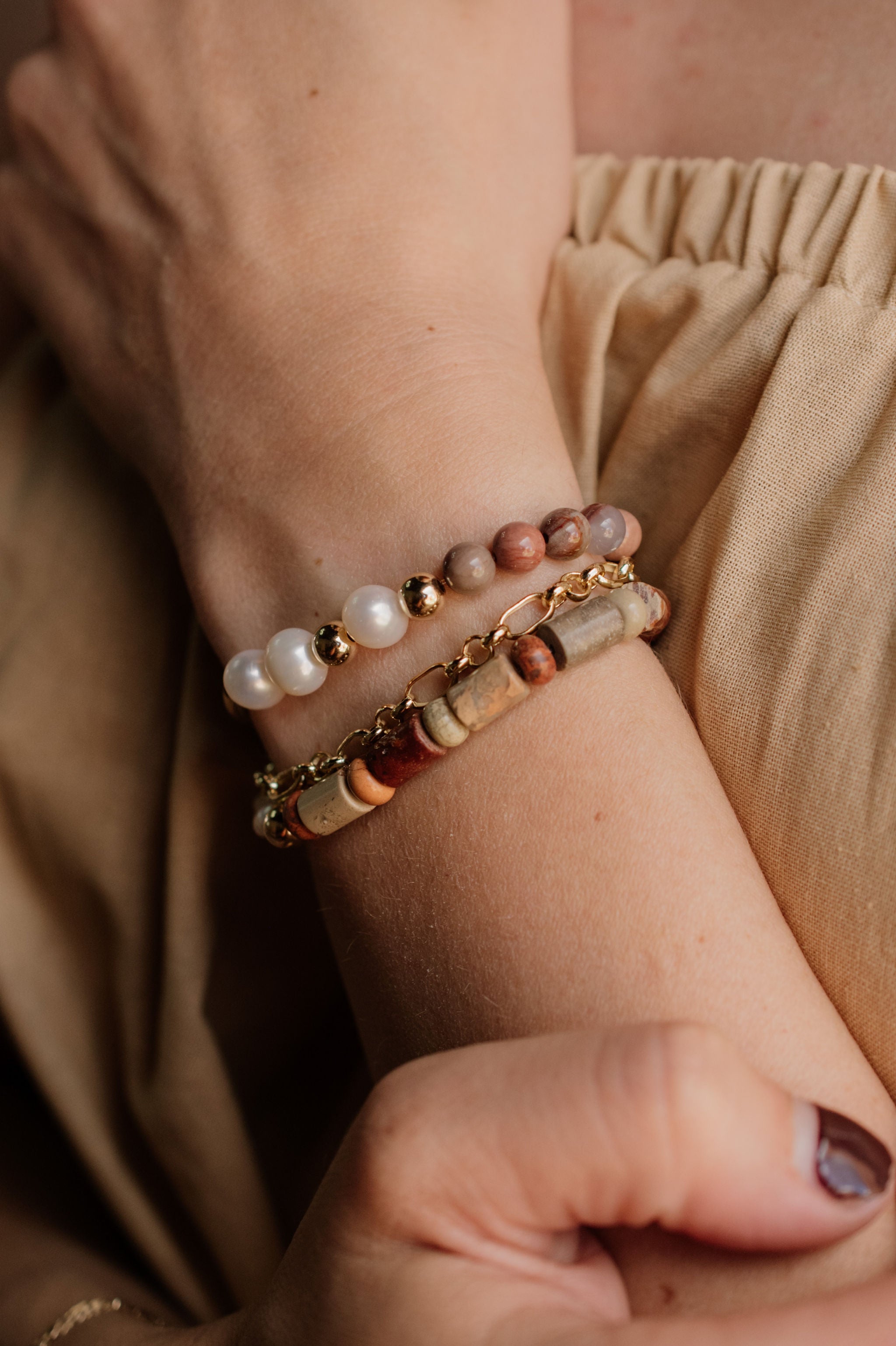 Elevate your accessory game with our handcrafted Eloise pearl X stone stretch cord bracelet. Crafted with a unique blend of earthy stone beads and irregular freshwater pearls, this bracelet showcases a harmonious mix of natural textures and patterns that promise to complement any outfit.