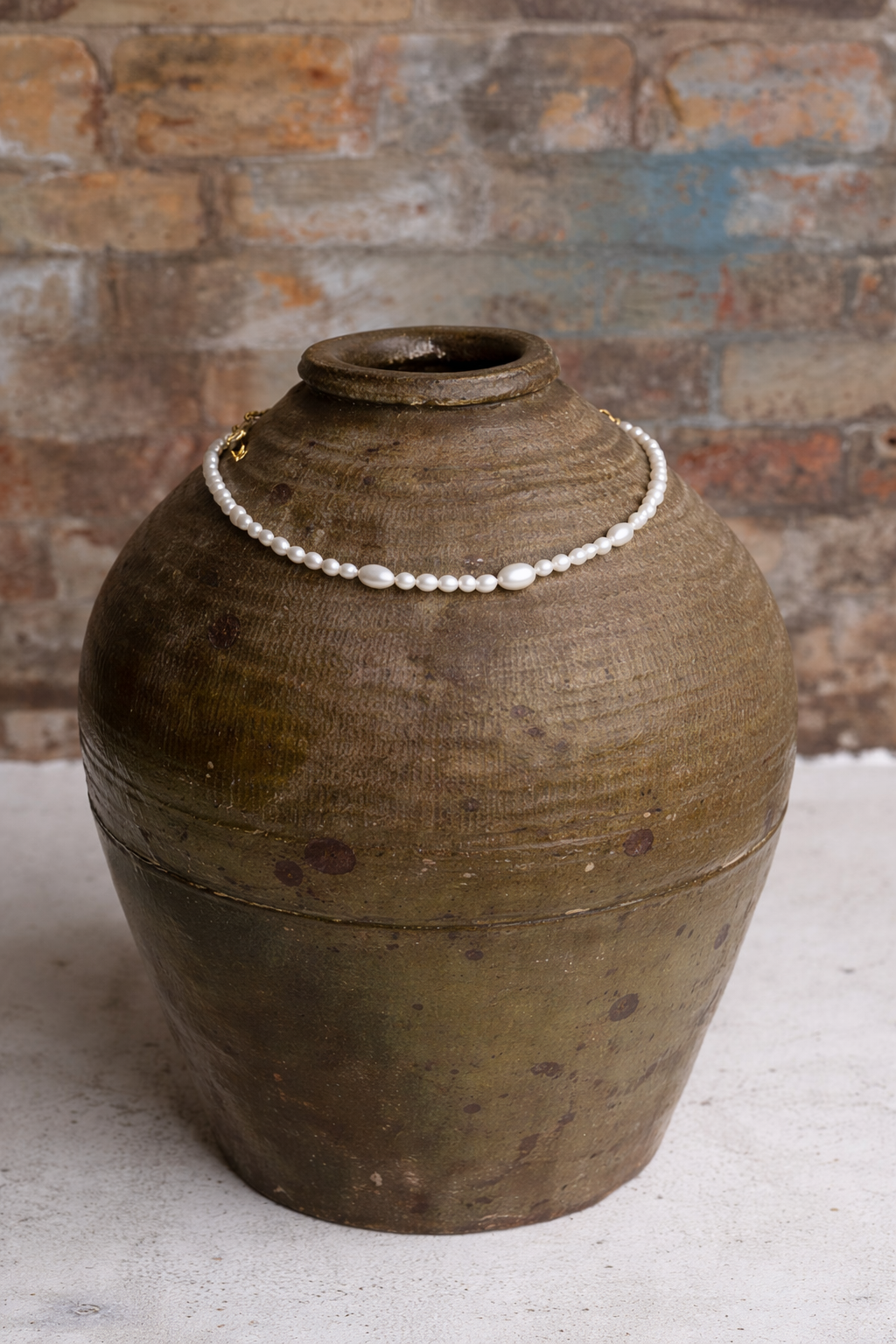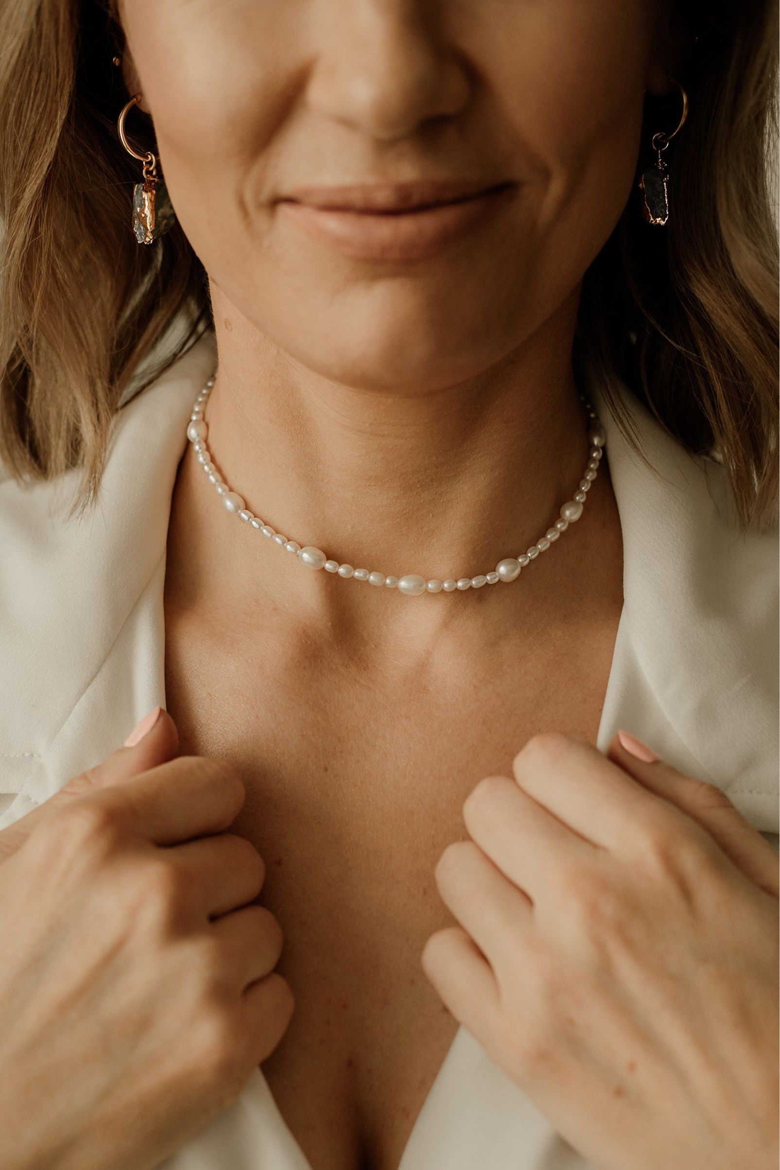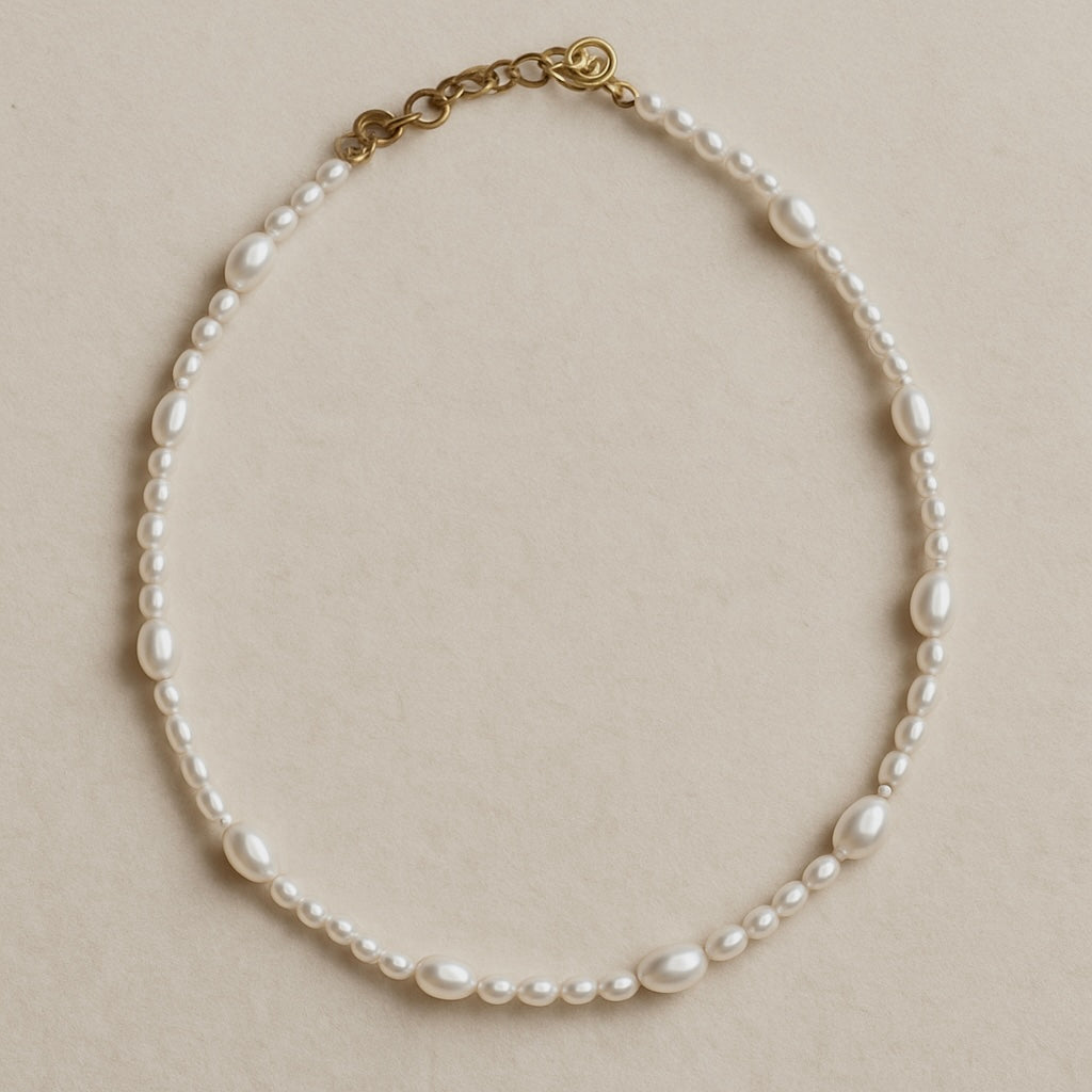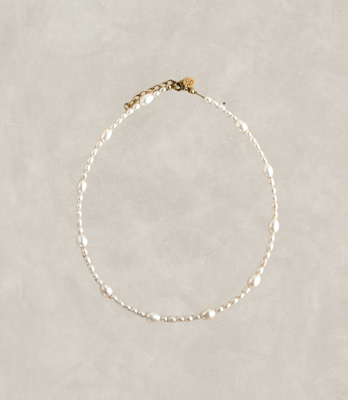 A modern twist on the traditional pearl necklace. A delightful mix of different sizes of freshwater rice pearls.