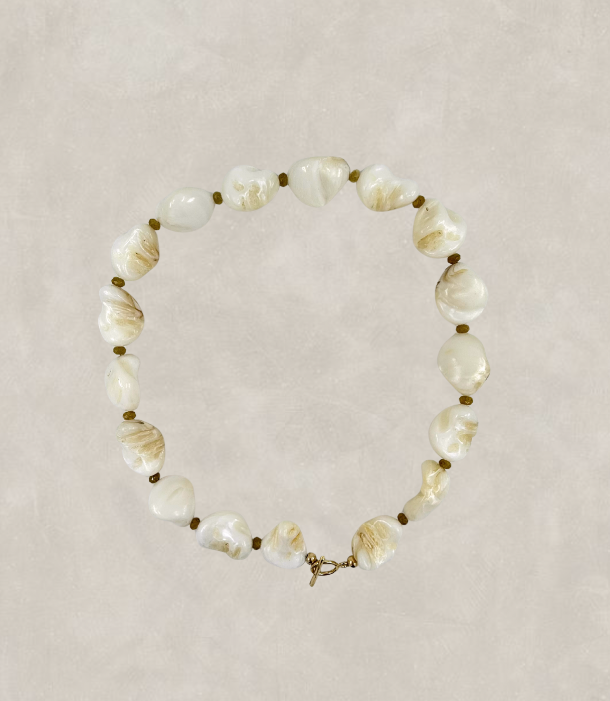 Enhance your jewellery collection with our Harper Shell Bead Necklace. Each shell bead is accompanied by a tiny coloured glass faceted bead finished with a sterling silver or 14k gold toggle clasp. Add charms (seperate listing) to elevate your look.