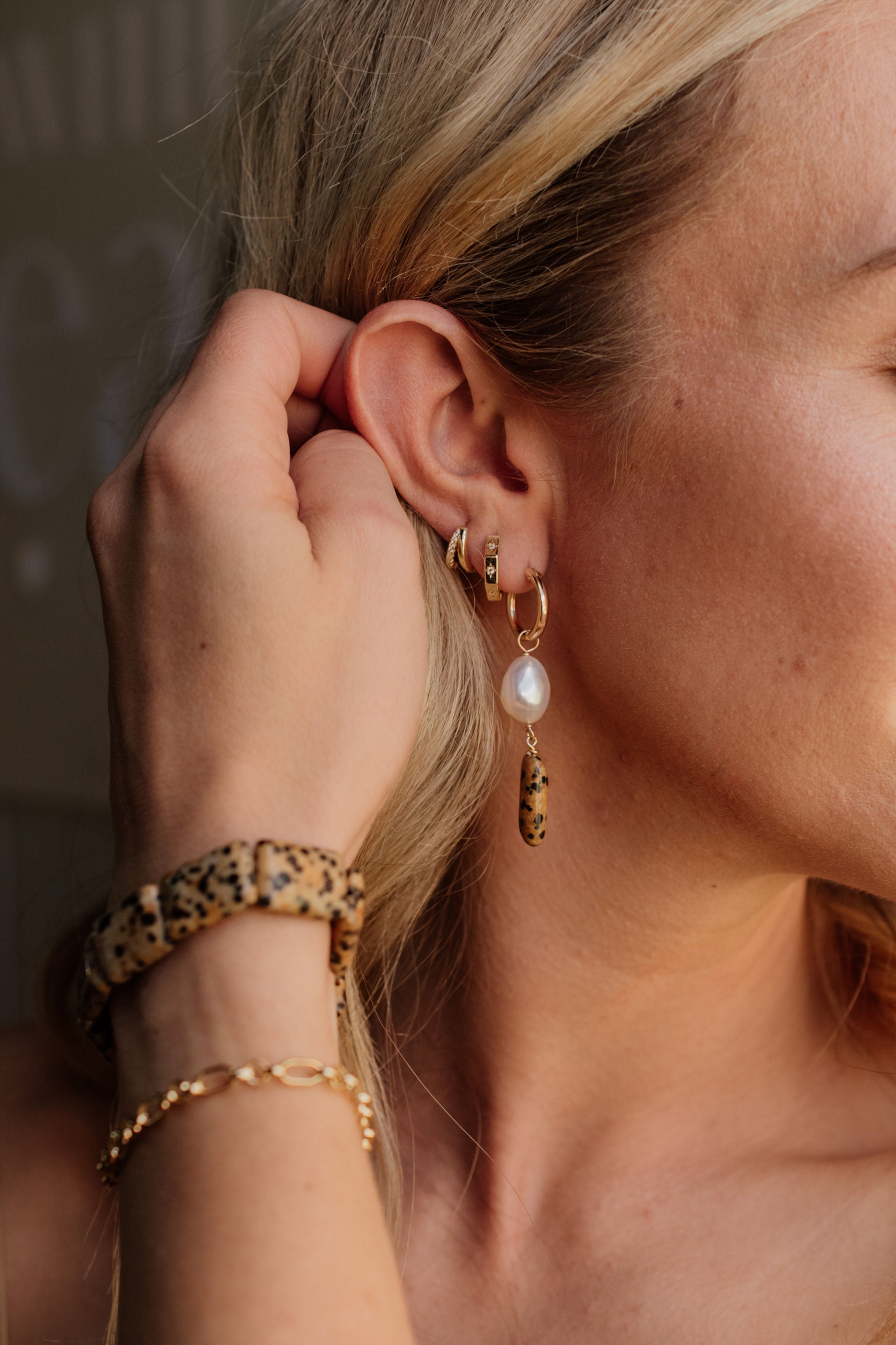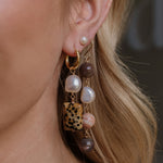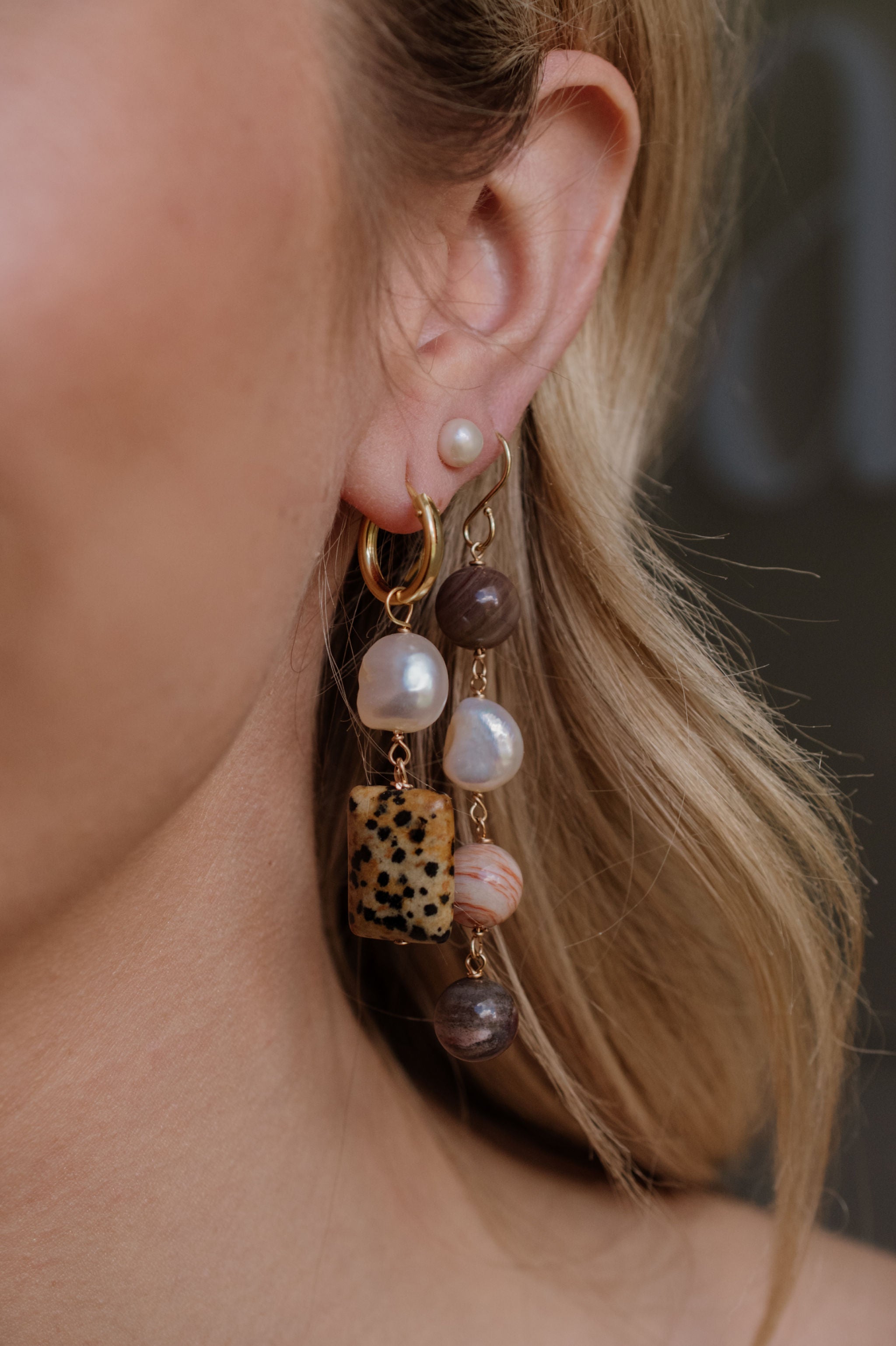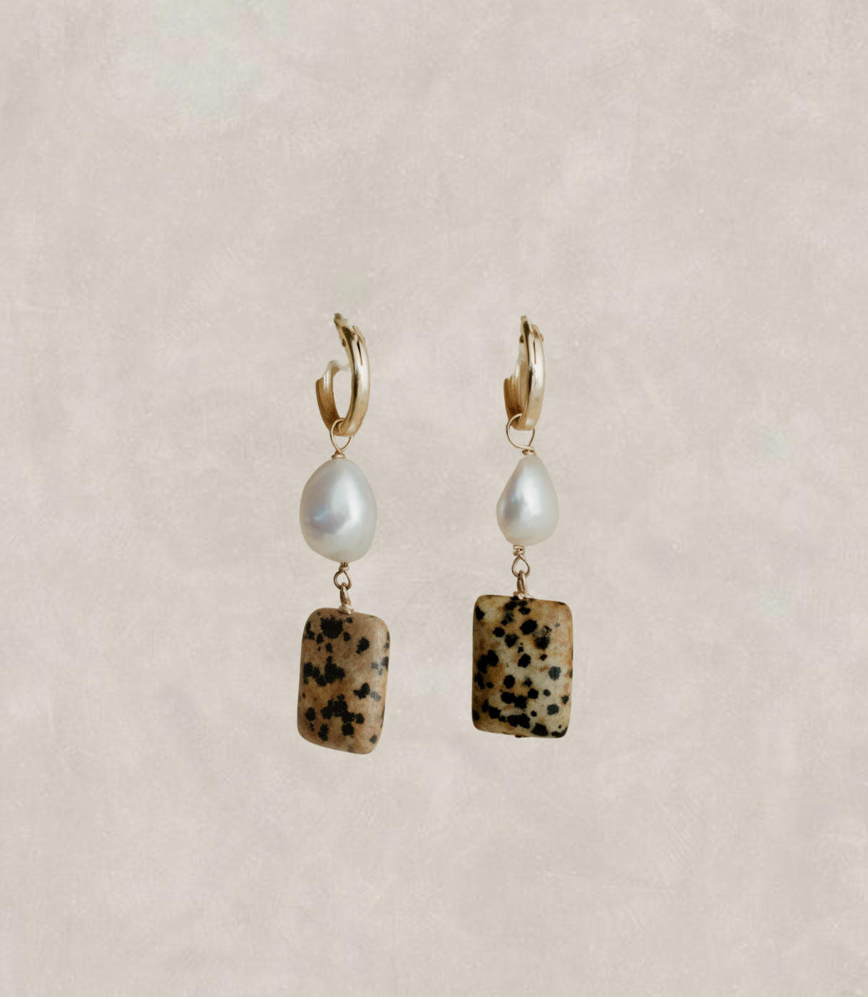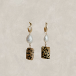 Elevate your style with our Josephine pearl X stone hoops, a stunning blend of nature and sophistication. Each earring features a unique, rectangular Balmatin stone with its distinctive speckled patterns, exuding earthy charm. Complemented by a lustrous freshwater pearl that gracefully dangles, these earrings capture a timeless elegance.