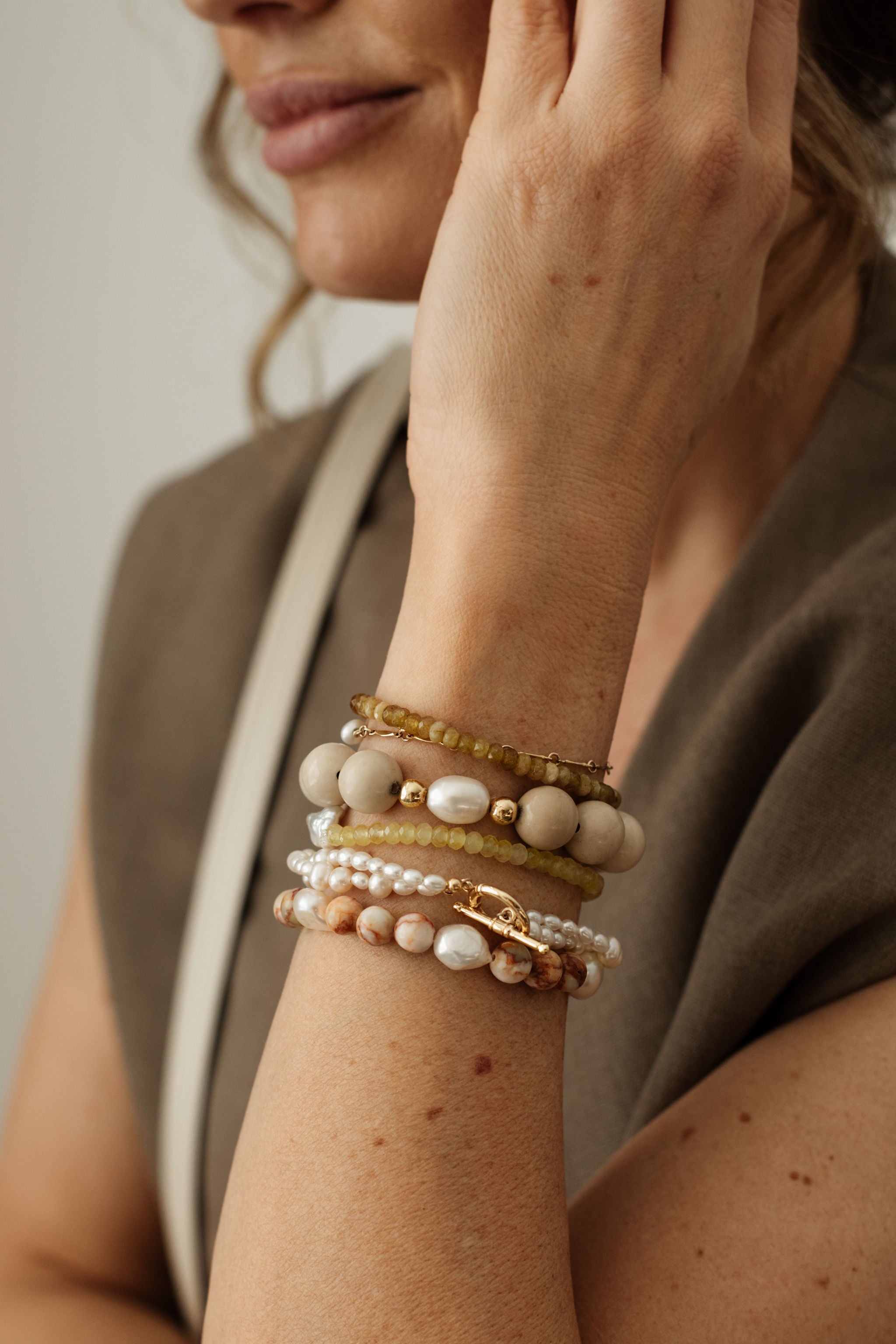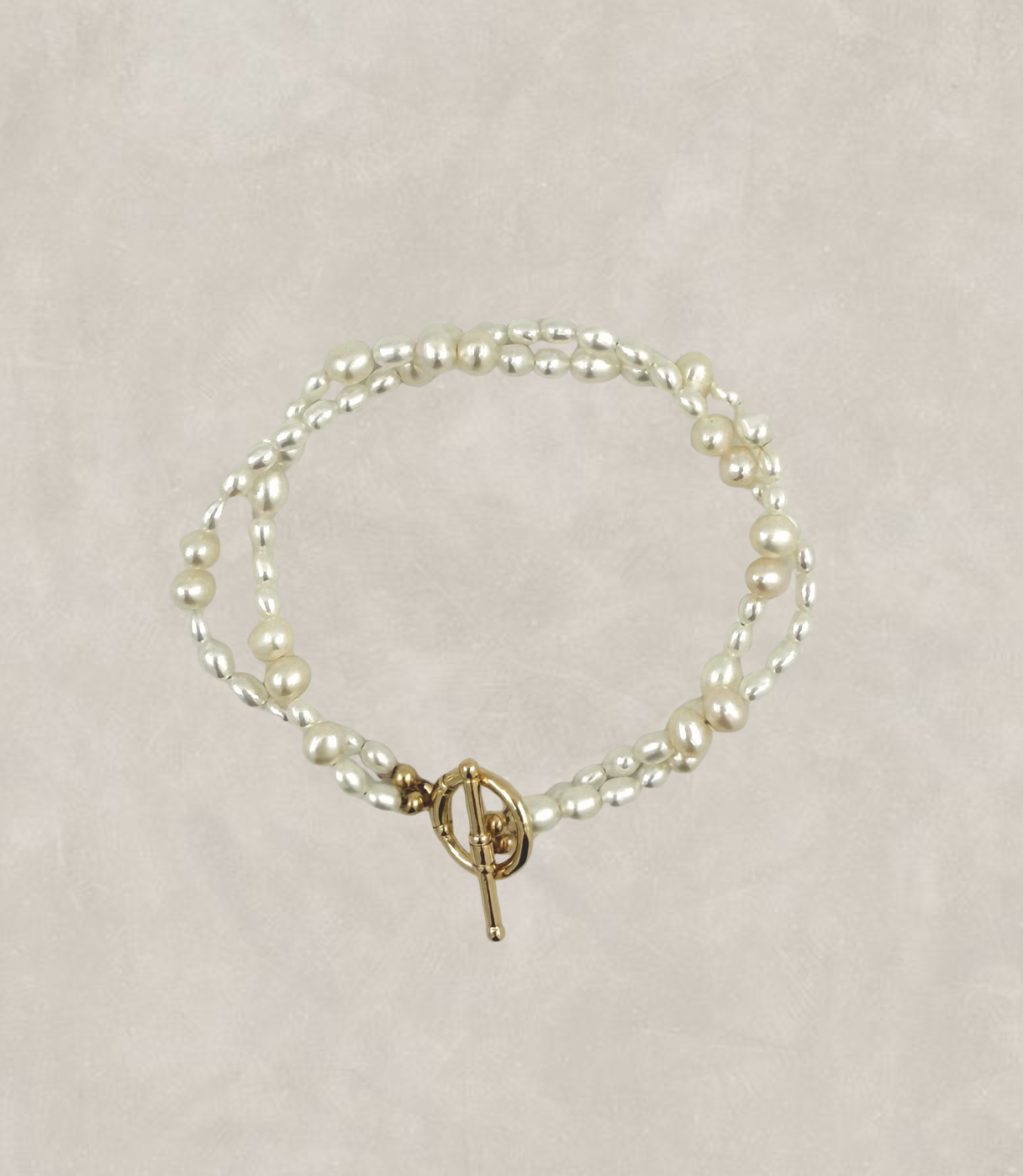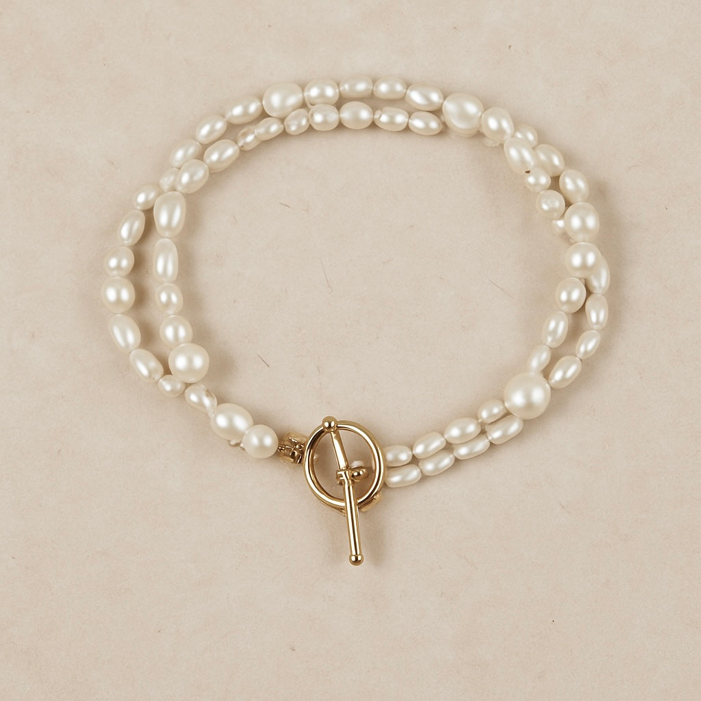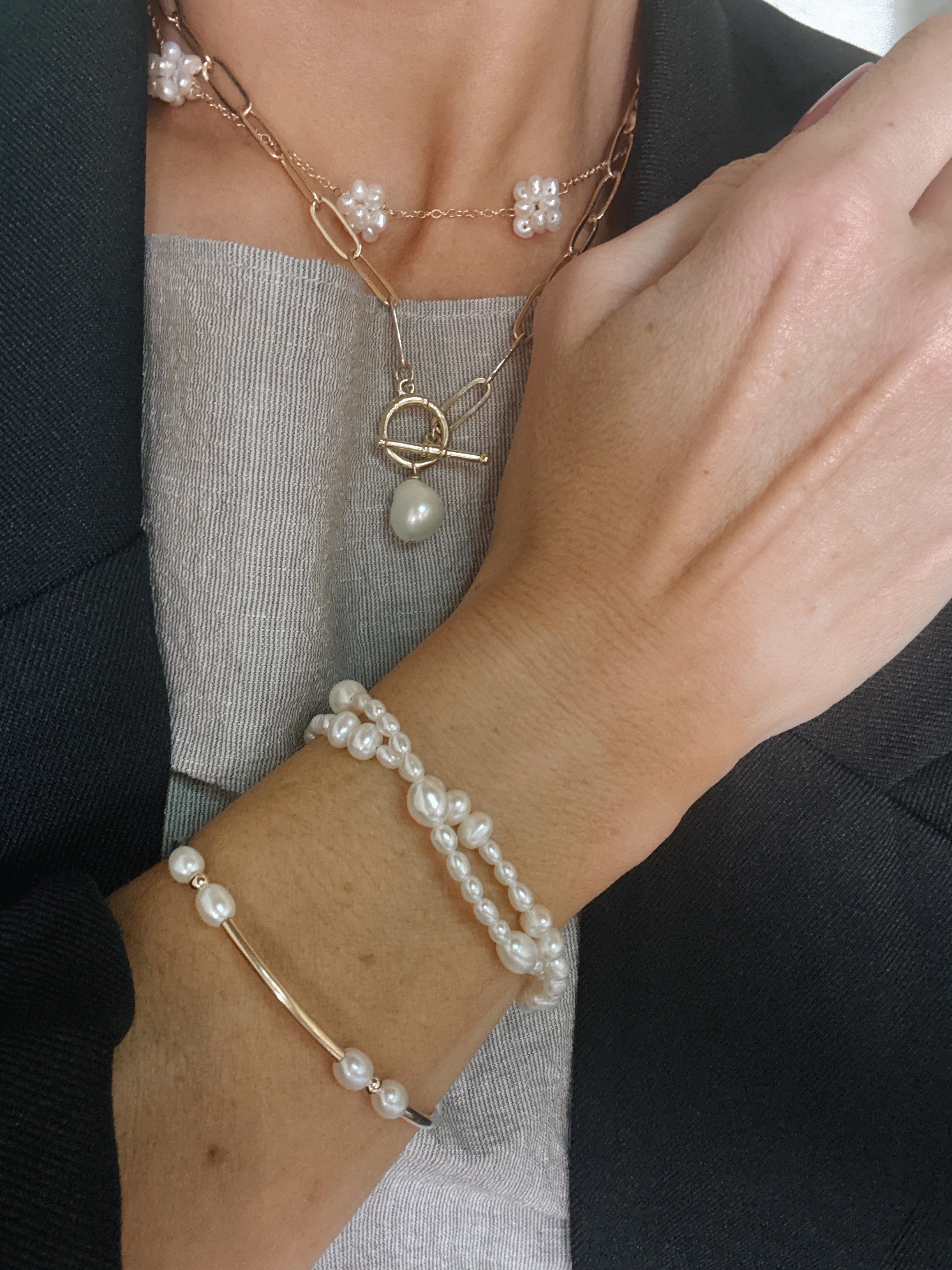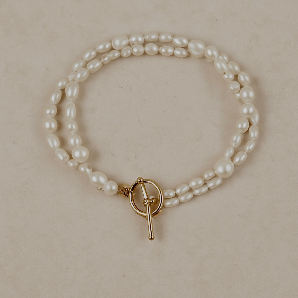 Elevate your style with our Rylee double strand pearl bracelet. This timeless piece combines classic charm with modern sophistication, featuring two beautifully crafted strands of lustrous pearls.