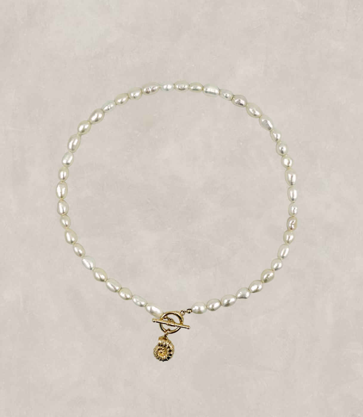 Elevate your style with our Kimberly Pearl Necklace, a symbol of grace and elegance. Crafted with lustrous freshwater pearls and finished with 14k gold plated toggle clasp and small 14k gold shell charm, this necklace is the perfect blend of classic beauty and modern charm.