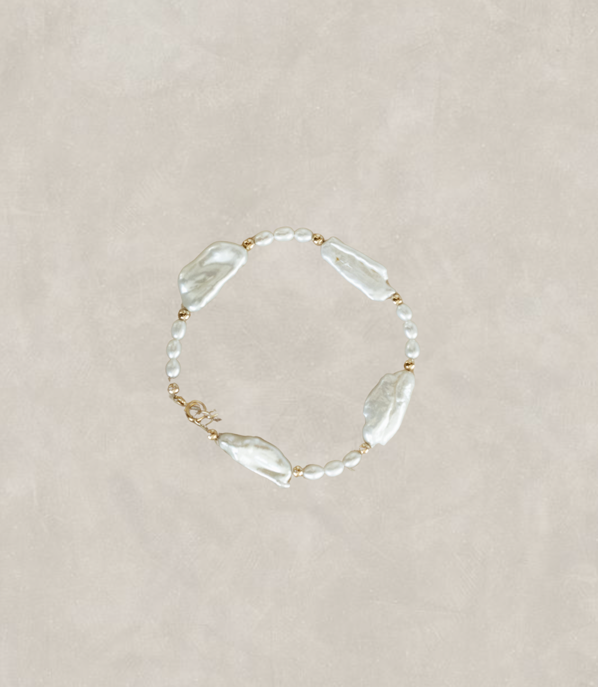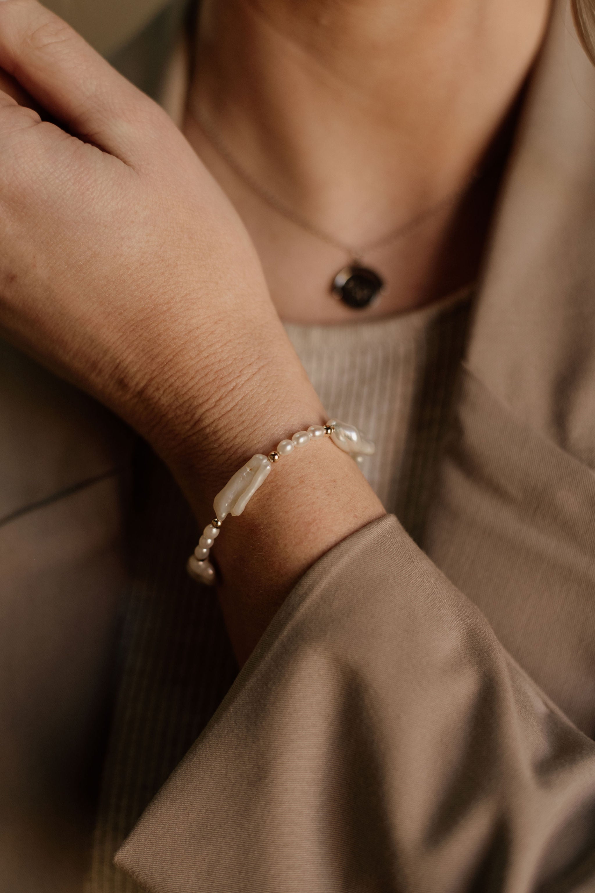 Elevate your style with our Laura bracelet, a perfect blend of classic elegance and modern sophistication. Crafted with attention to detail, this bracelet features lustrous freshwater Rice and Biwa pearls delicately interspersed with polished sterling silver or 14k gold filled beads, creating an eye-catching contrast that exudes timeless charm.