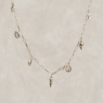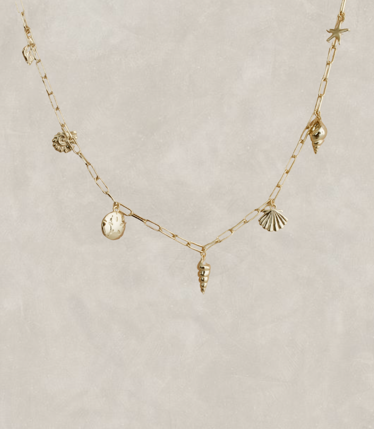 Elevate your accessory game with our enchanting Luca Seashell Charm Necklace, a delightful piece designed for beach lovers and ocean enthusiasts alike. Crafted from high-quality gold or silver-tone metal, this necklace features a delicate paperclip chain adorned with charming seashells, starfish, and ocean-inspired motifs. Pictured, stacked with Zinnia on our model.