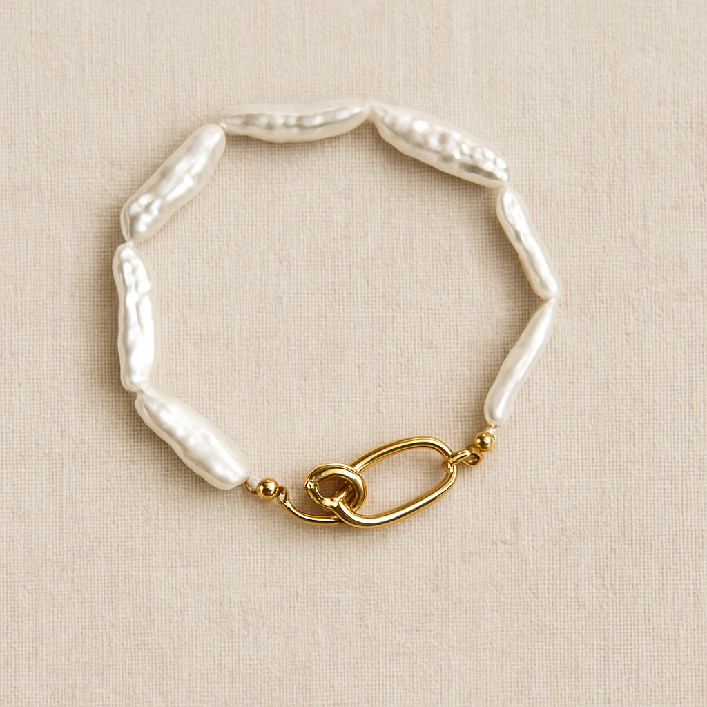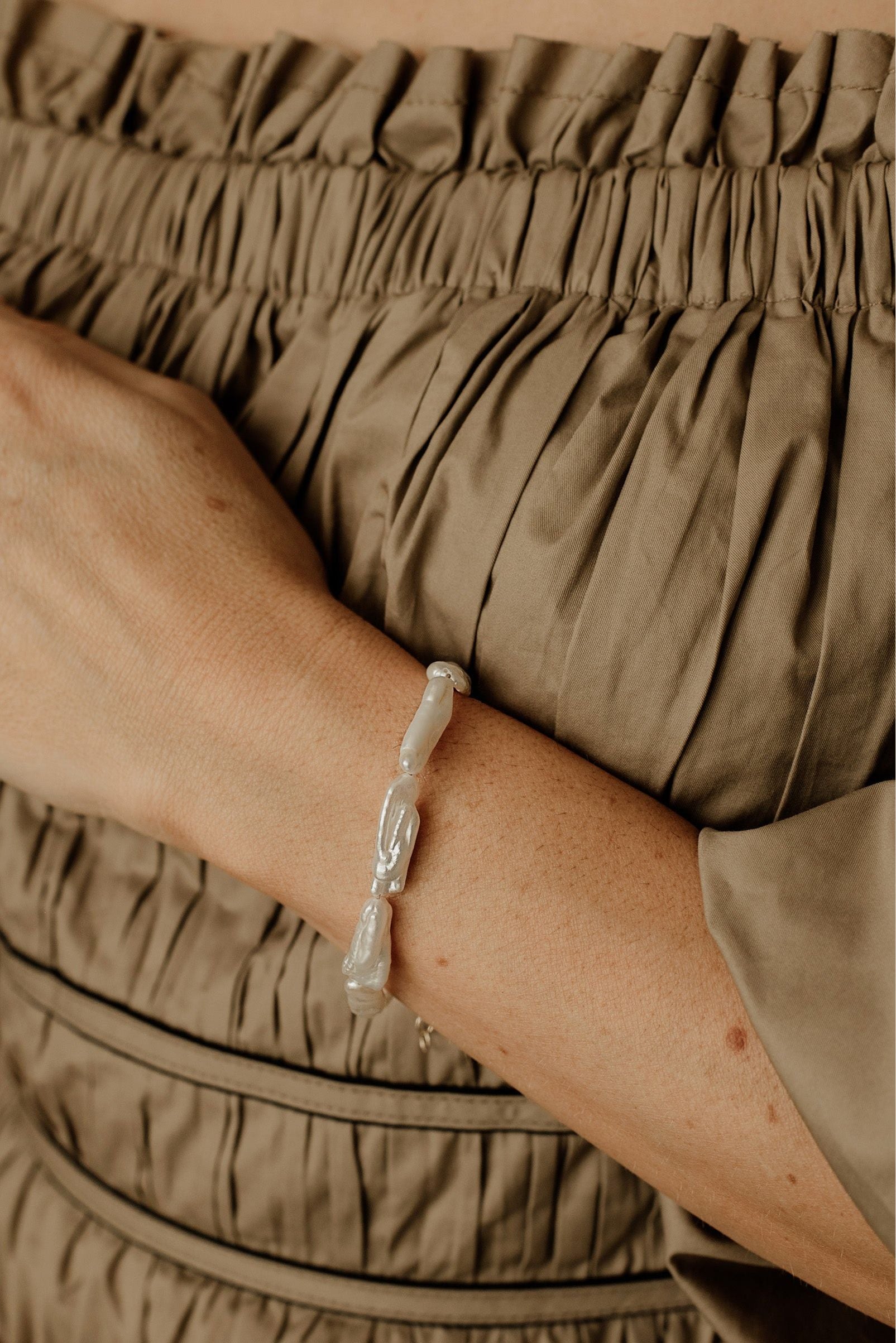 Luna - Shes by far one of our all time favs. Stunning bracelet featuring a strand of magical irregular long baroque pearls with your choice of platinum or 14k gold plated clasp. Match back with our Luna necklace to complete your look.