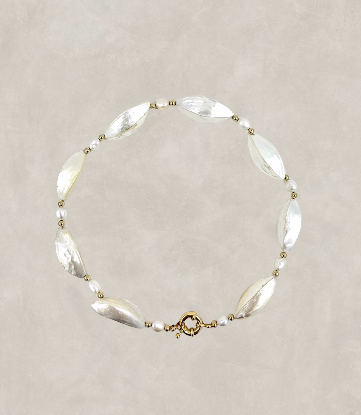 Perfect for both day and evening looks, this necklace is an exquisite addition to any jewelry collection. Ideal for gifting or adding a touch of elegance to your personal style. Made from shell beads intercepted by 14k gold filled beads and finished with 14k gold sailor clasp