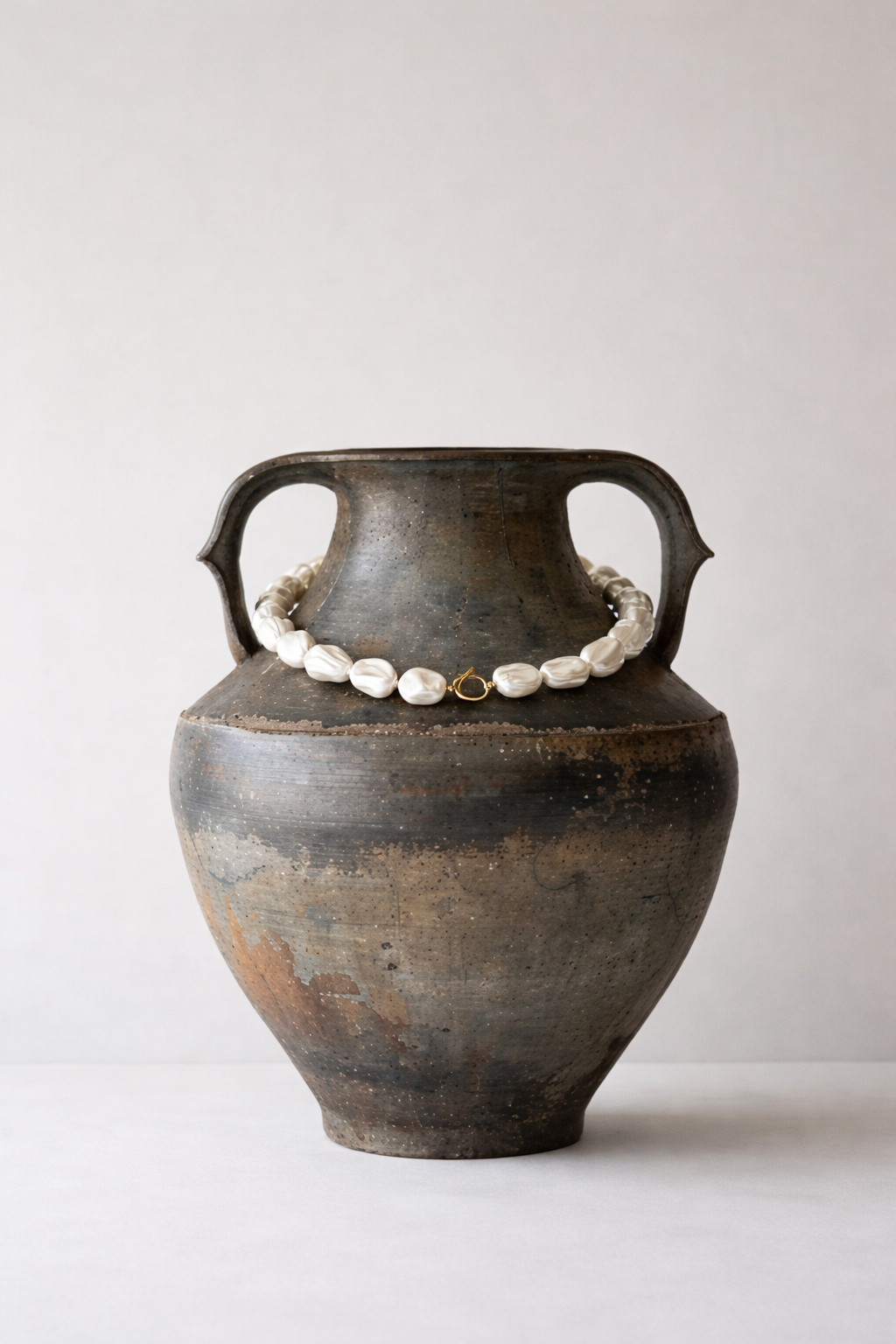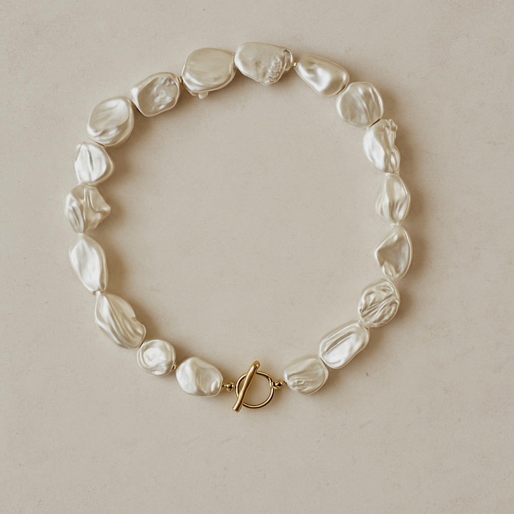 Embrace timeless elegance with our Marjorie Keshi Pearl Necklace. Crafted with unique, naturally-shaped pearls, this necklace adds a touch of sophistication to any look. Available in platinum or 14k gold plated clasp options.