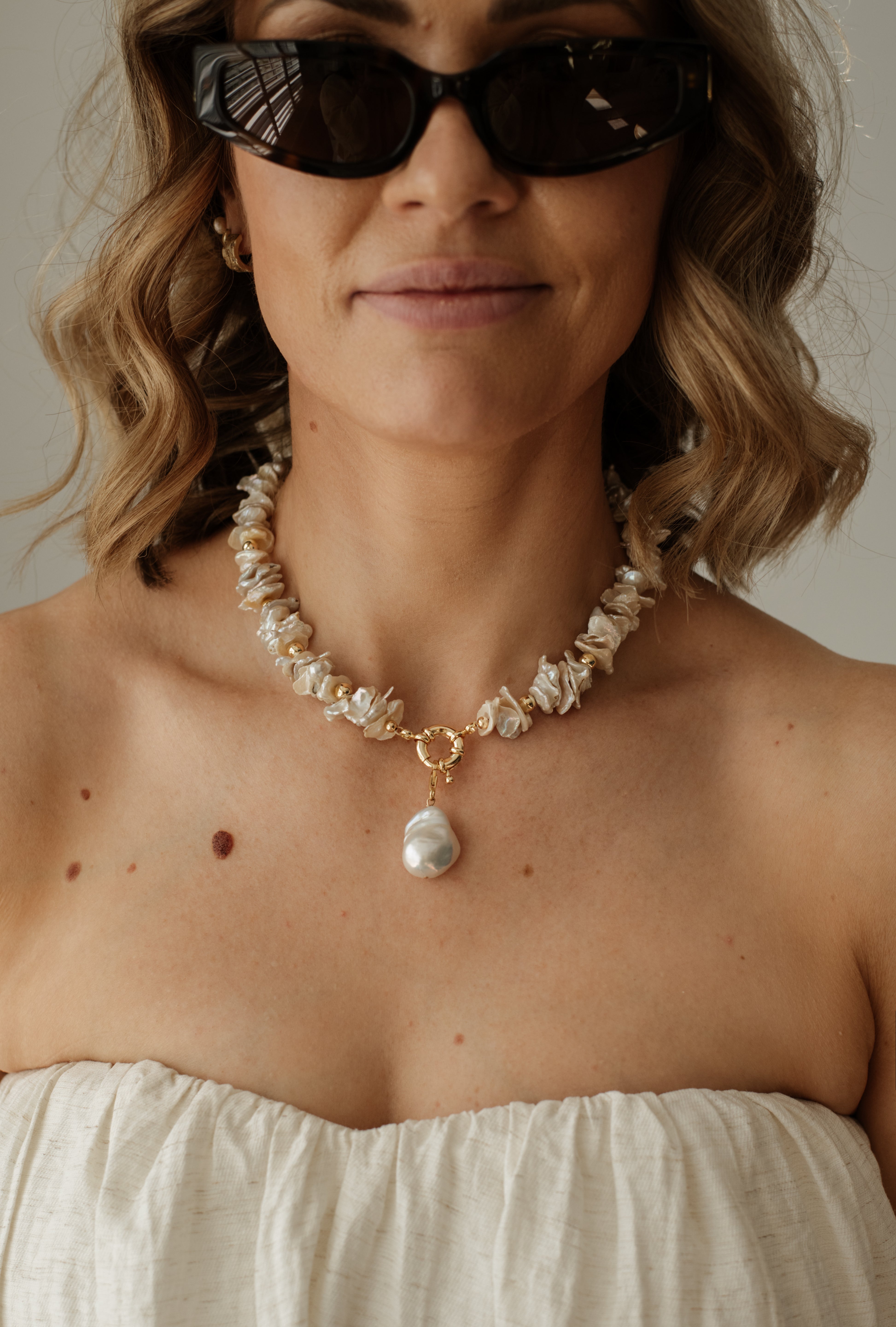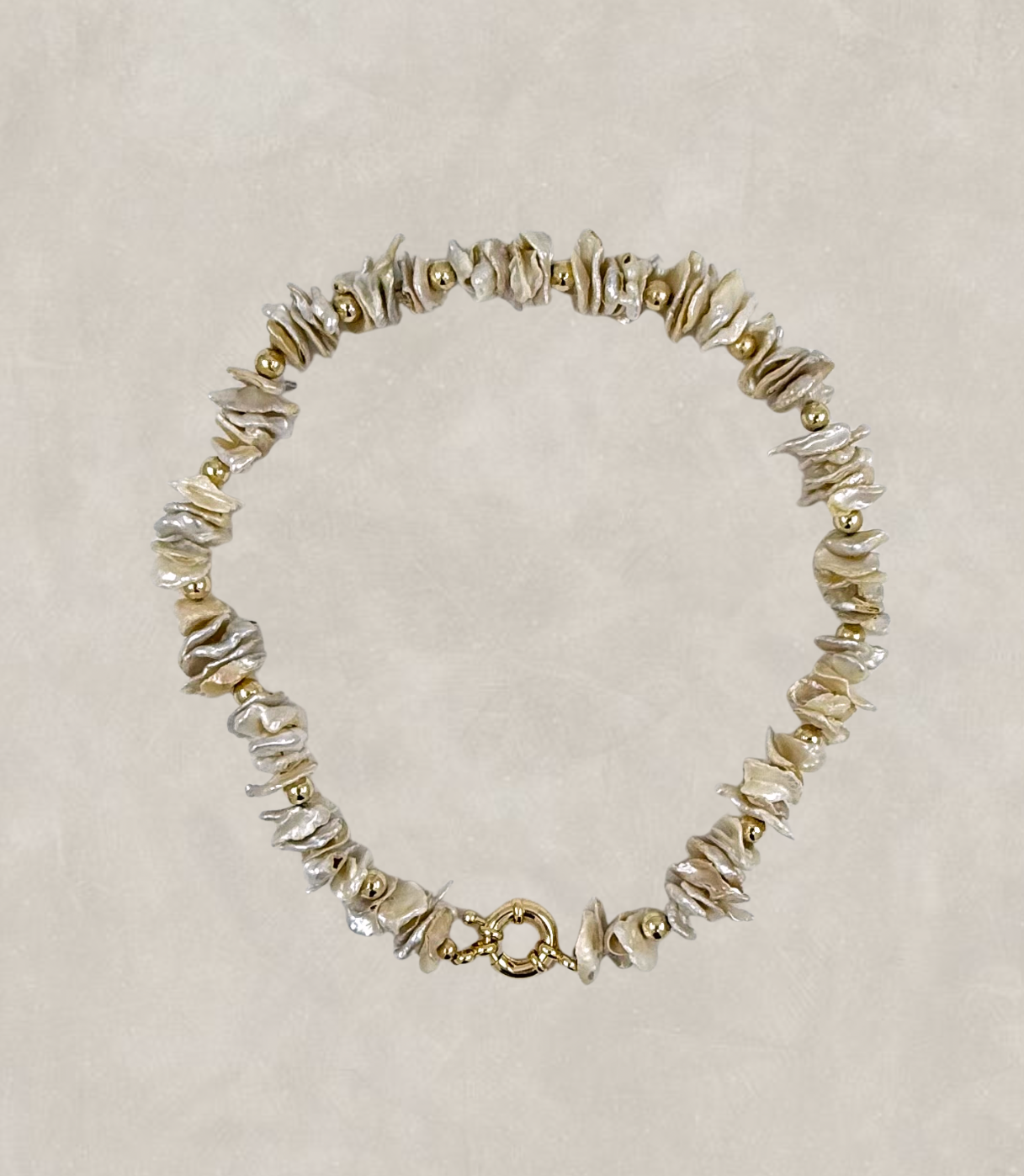 Elevate your style with our Reese Petal Pearl Necklace, a stunning piece that captures the essence of natural beauty and elegance. This necklace is crafted with uniquely shaped Keshi petal pearls, each one radiating a soft, lustrous glow that captivates the eye.