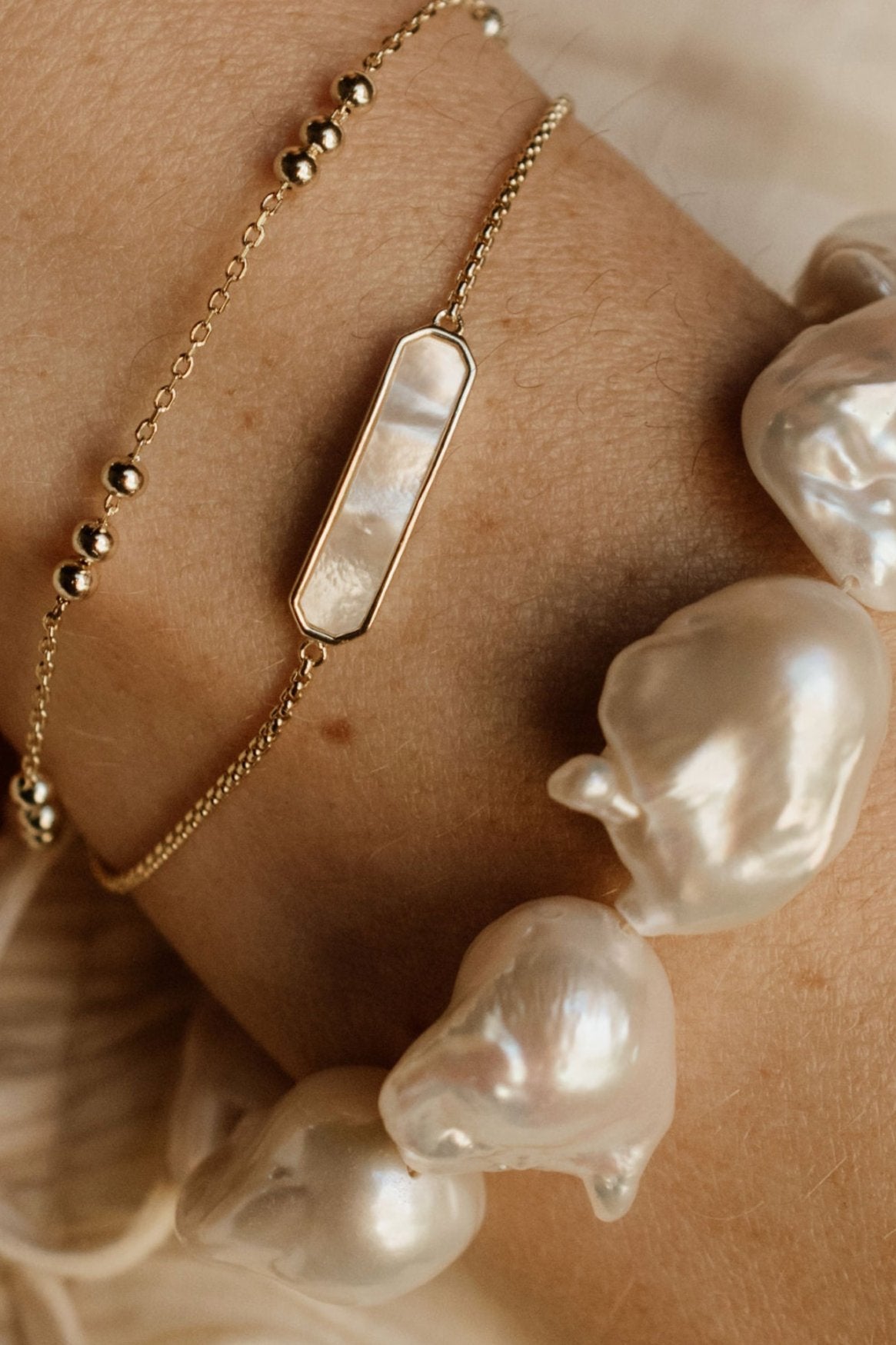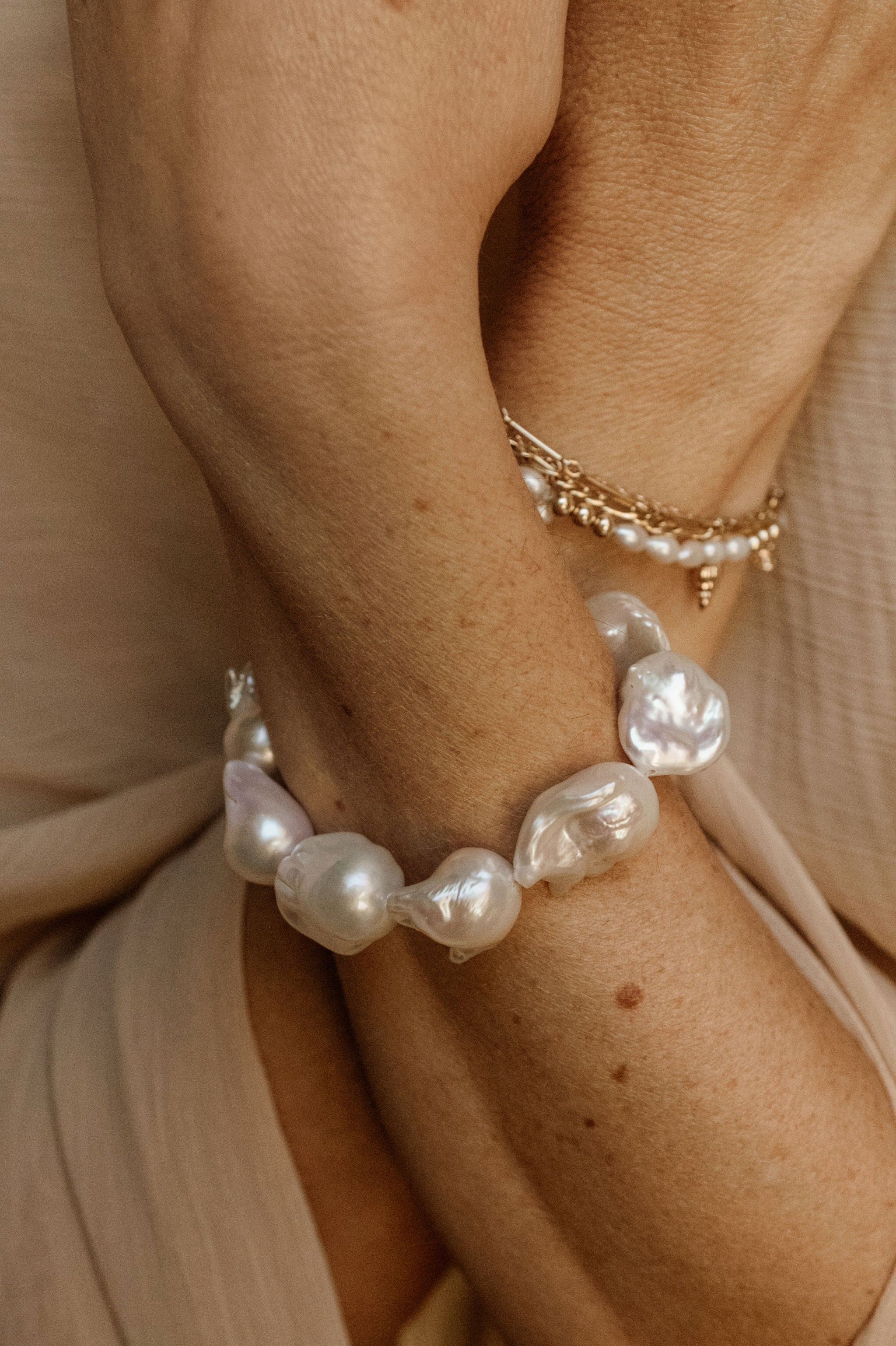 Completely elevate your accessory game with our exquisite OCTAVIA baroque pearl bracelet. This stunning piece showcases a collection of uniquely shaped, lustrous nuclear baroque pearls that shimmer with every movement. This piece is from our deluxe range which will be cherished and passed down from generation to generation.