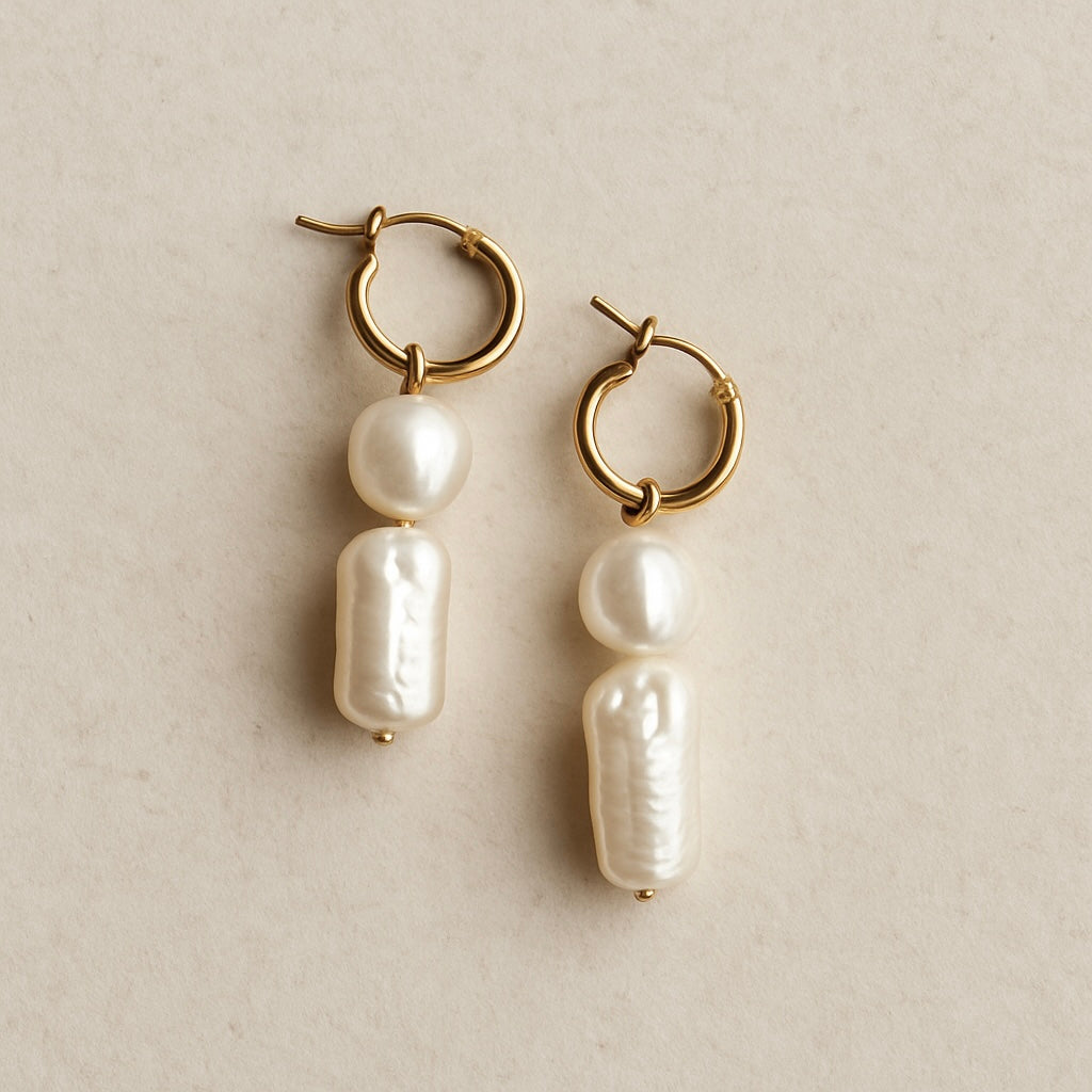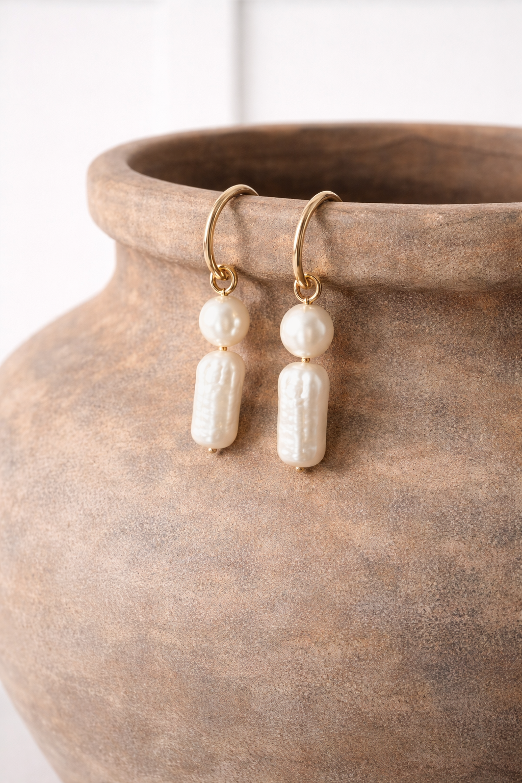 Olive - Another of my favourite pieces from our refined range. Sweet, subtle and elegant. 15mm sterling silver or 14k gold filled hinged hoop featuring medium off round and long baroque pearl drop. Shes quite the classic piece you will constantly grab for.