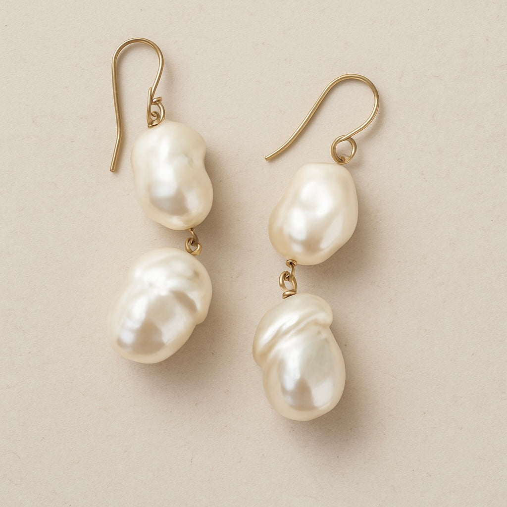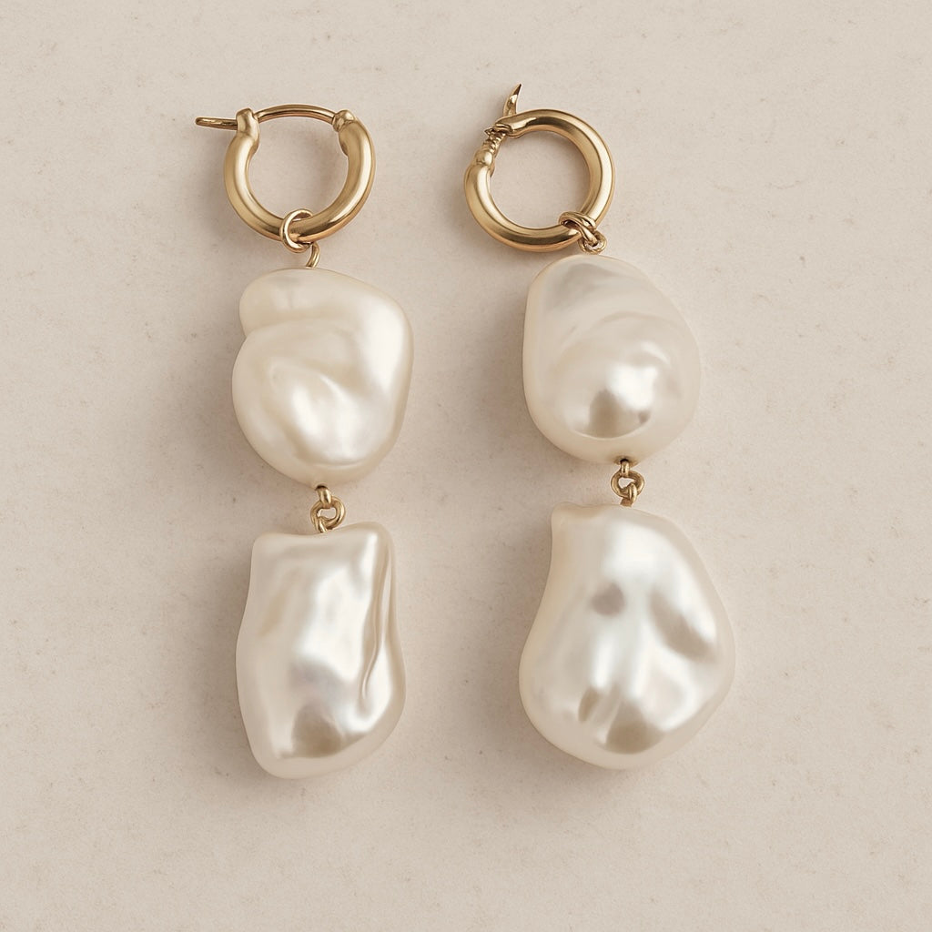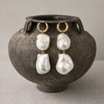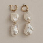 Olivia isn’t for the faint hearted. Possessing the most amazing style, sophistication and class. Not one but two large baroque pearl drops on each hoop on your choice of 14k gold filled or sterling silver 15mm hinged hoop or hook option. Approx drop of this piece is 7cm.