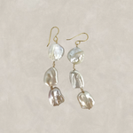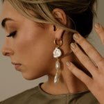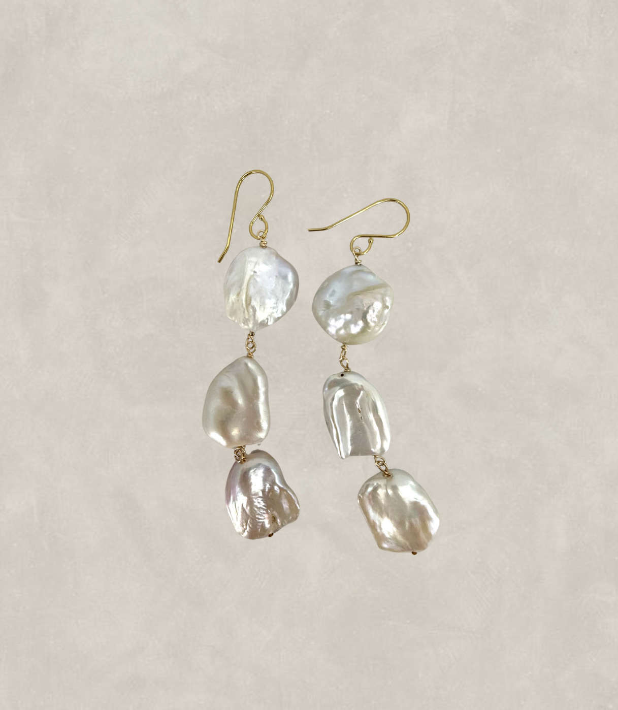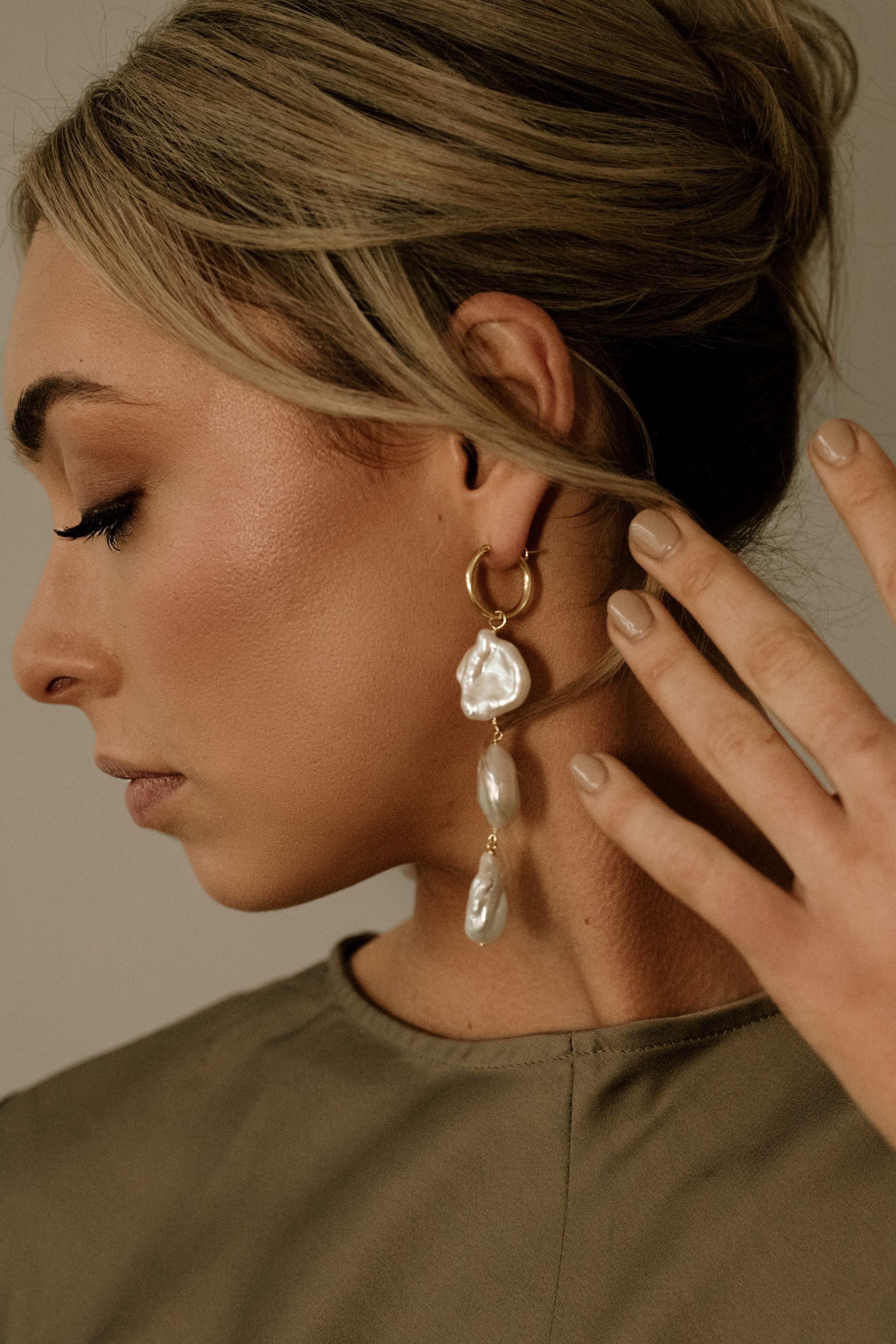 Lou - She is simply stunning and an absolute shop stopper of a piece. By far one of our personal faves. Lou features your choice of 14k gold filled or sterling silver 20mm hinged hoop with a drop of three freshwater Keshi pearls.