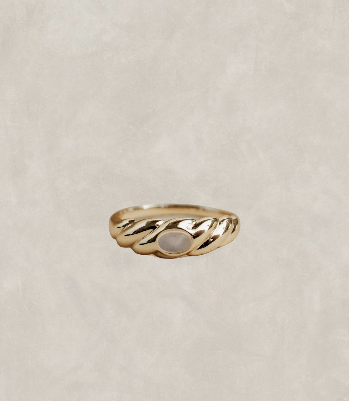 Elevate your elegance with our Mother of Pearl Croissant Ring, available in sterling silver or 18k gold vermeil. This exquisite piece features a lustrous Mother of Pearl center stone on a croissant-inspired twisted band design, blending classic charm with modern sophistication. Perfect for everyday wear or special occasions, this versatile accessory makes a timeless gift.