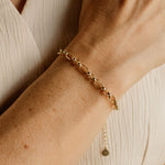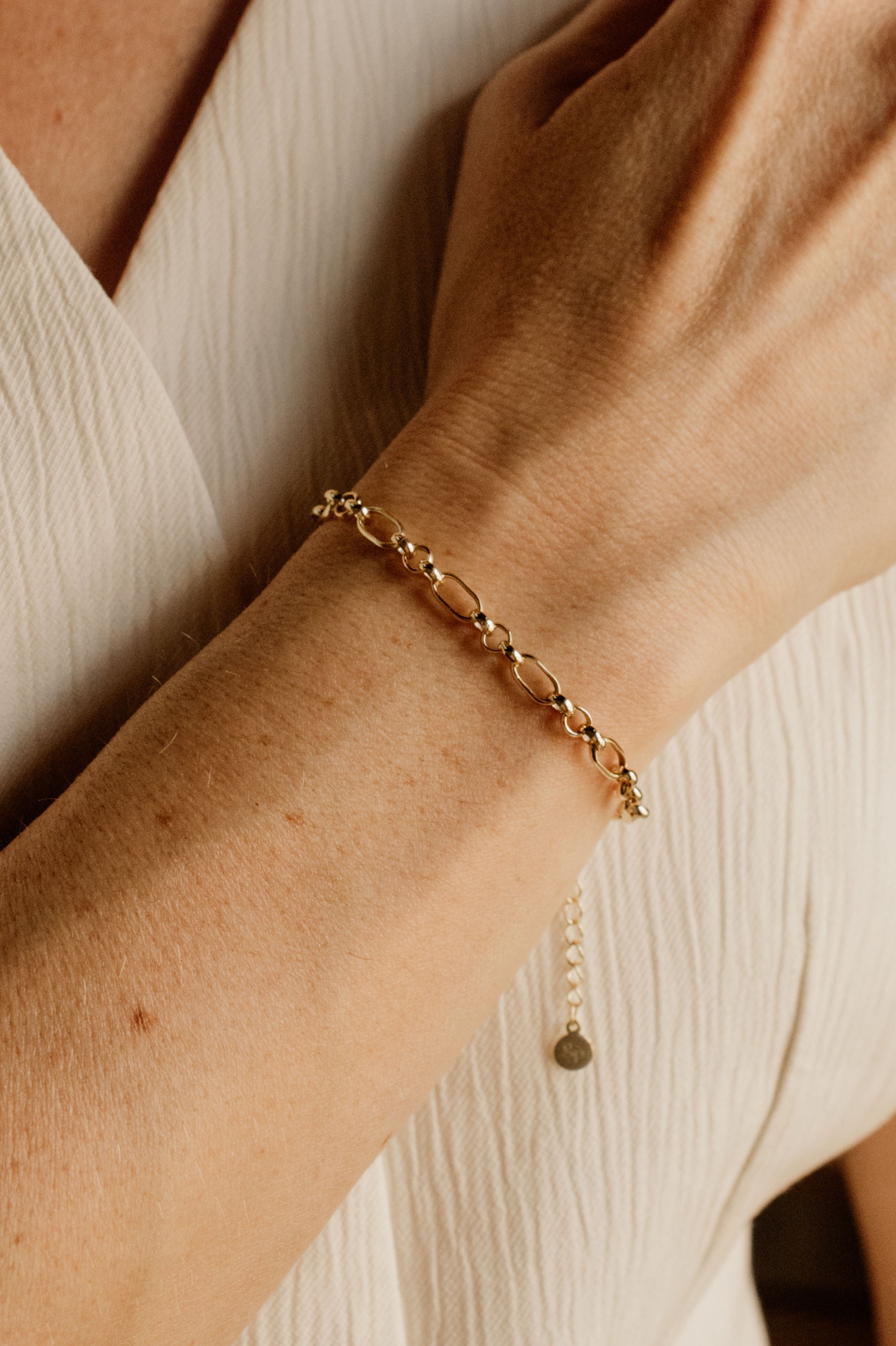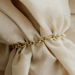 Elevate your accessory game with our stunning Rhia Gold Link Bracelet, a perfect blend of elegance and contemporary design. Crafted from high-quality gold-tone metal, this bracelet features a captivating sequence of interlocking links that create a sophisticated and stylish look.
