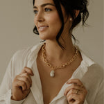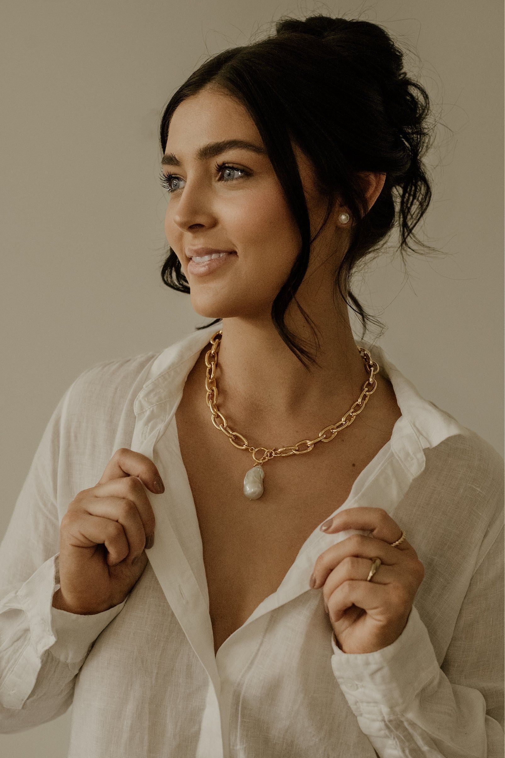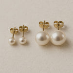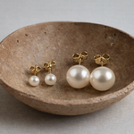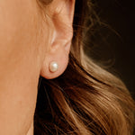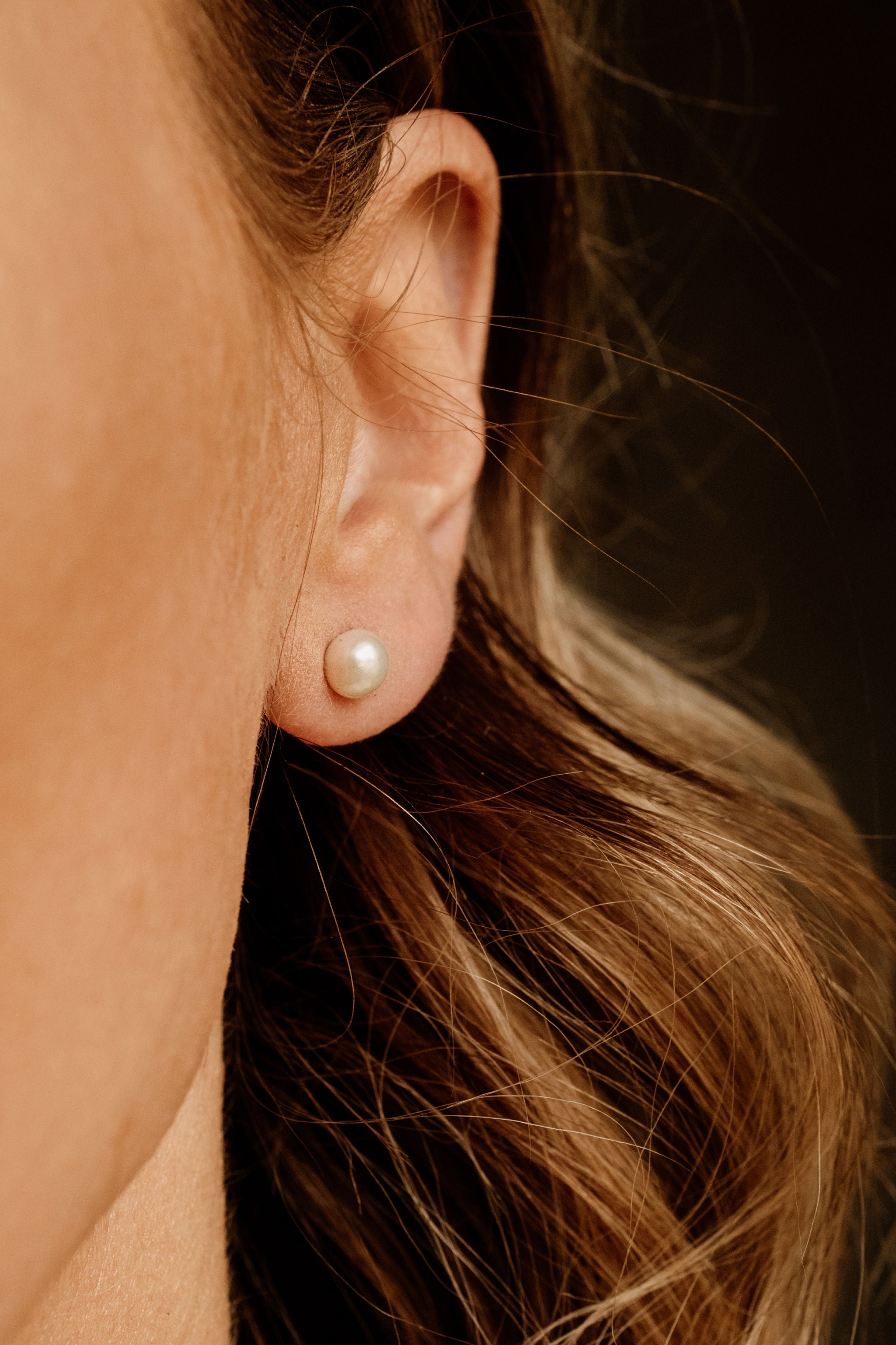 Sage is the epitome of grace, class and elegance with a twist of on trend style. Perfect for everyday wear. Sage features 14k gold plated (1 micron on sterling silver base) or sterling silver, silver plated post and irregular freshwater baroque pearl. Available in 6mm and 10mm. Model one wearing 10mm, Model two wearing 6mm.