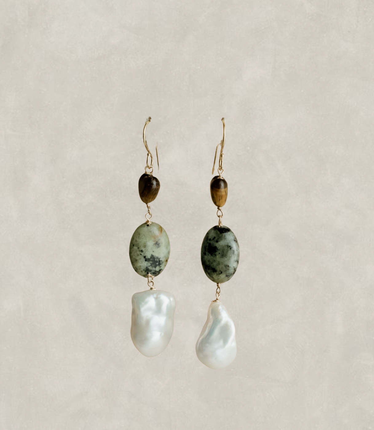 Elevate your accessory game with our Samantha stone X pearl earrings, a perfect blend of elegance and bohemian charm. Handcrafted with care, these earrings feature an array of exquisite natural stones and irregular freshwater pearls, each uniquely shaped and coloured to create a harmonious blend of earthy tones.