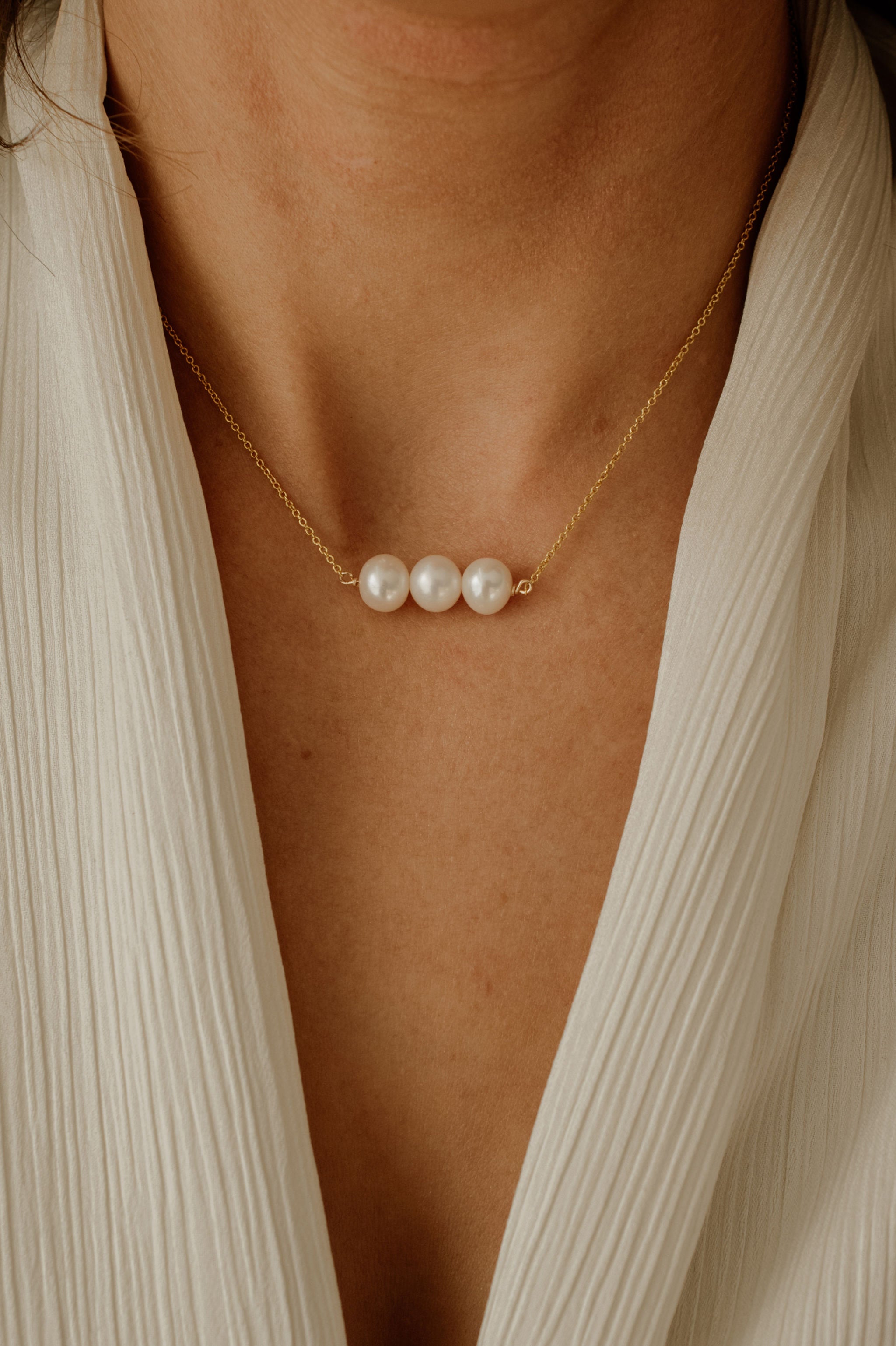 Savannah - Features a bar of three medium freshwater off-round irregular pearls on your choice of sterling silver or 14k gold filled 1.5mm chain.