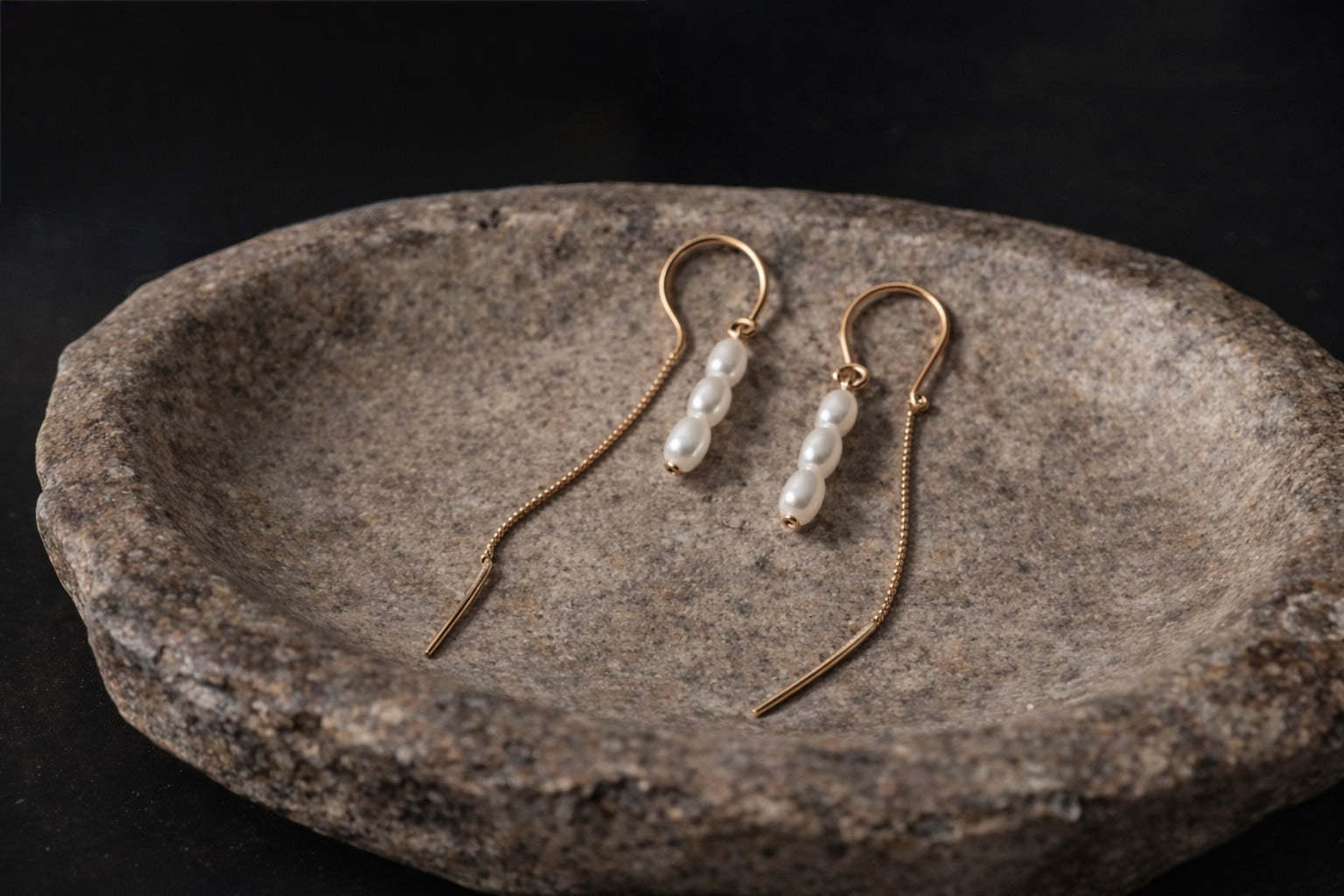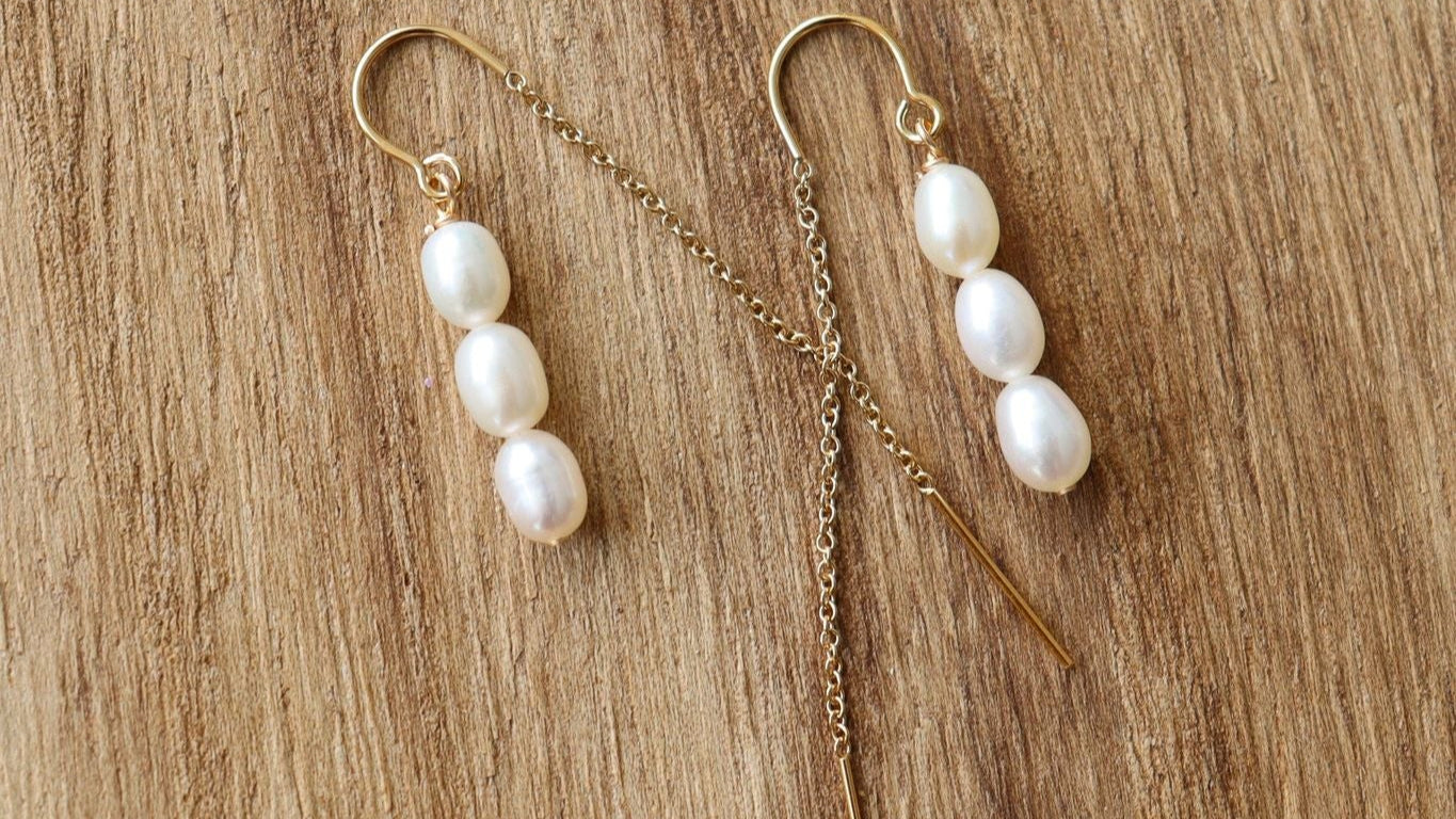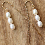 Serenity - Three tiny freshwater rice pearls hung on sterling silver or 14k gold filled u-bar thread earrings. Match back with our serenity bracelet, anklet and Winnie necklace.