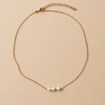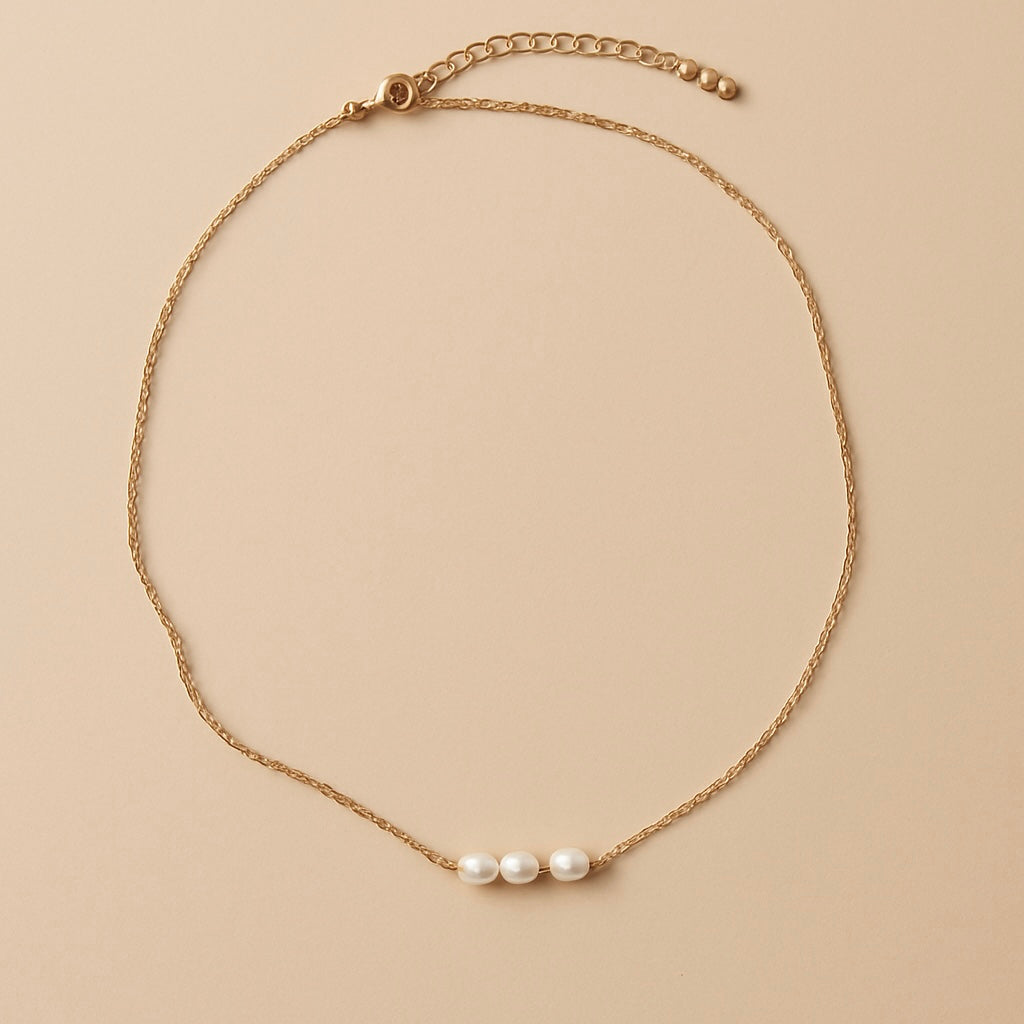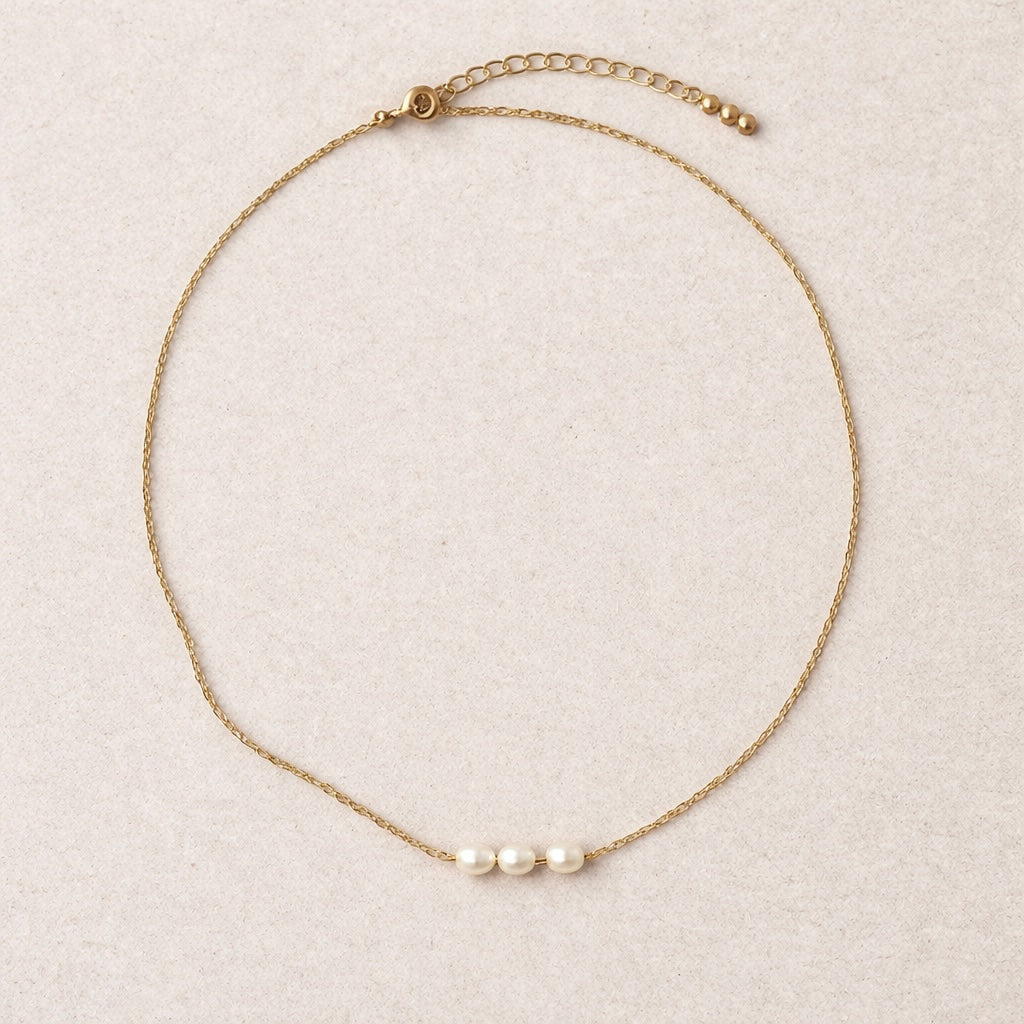 Serenity - Features a bar of three tiny freshwater rice pearls on your choice of sterling silver or 14k gold plated options.