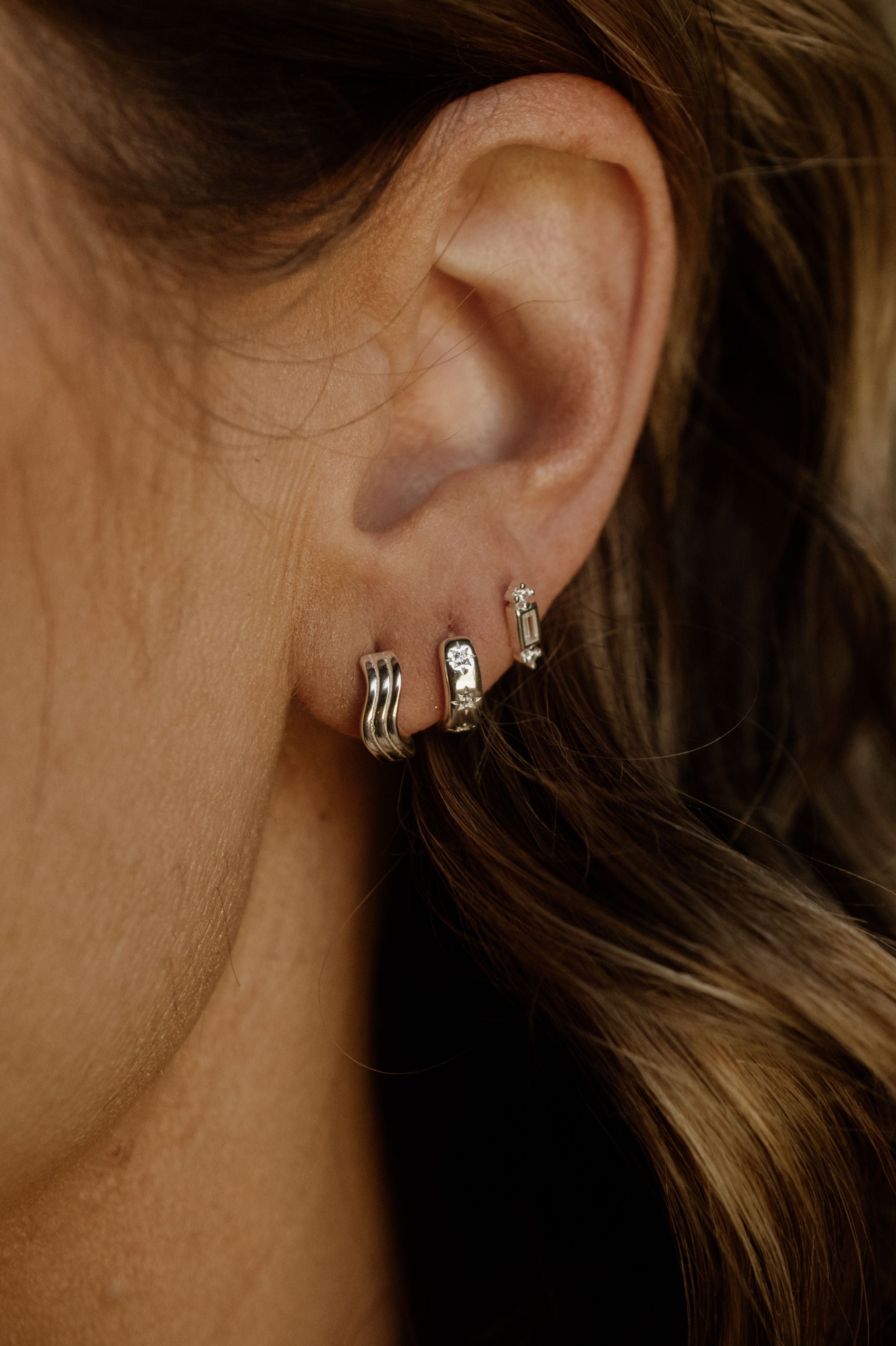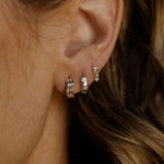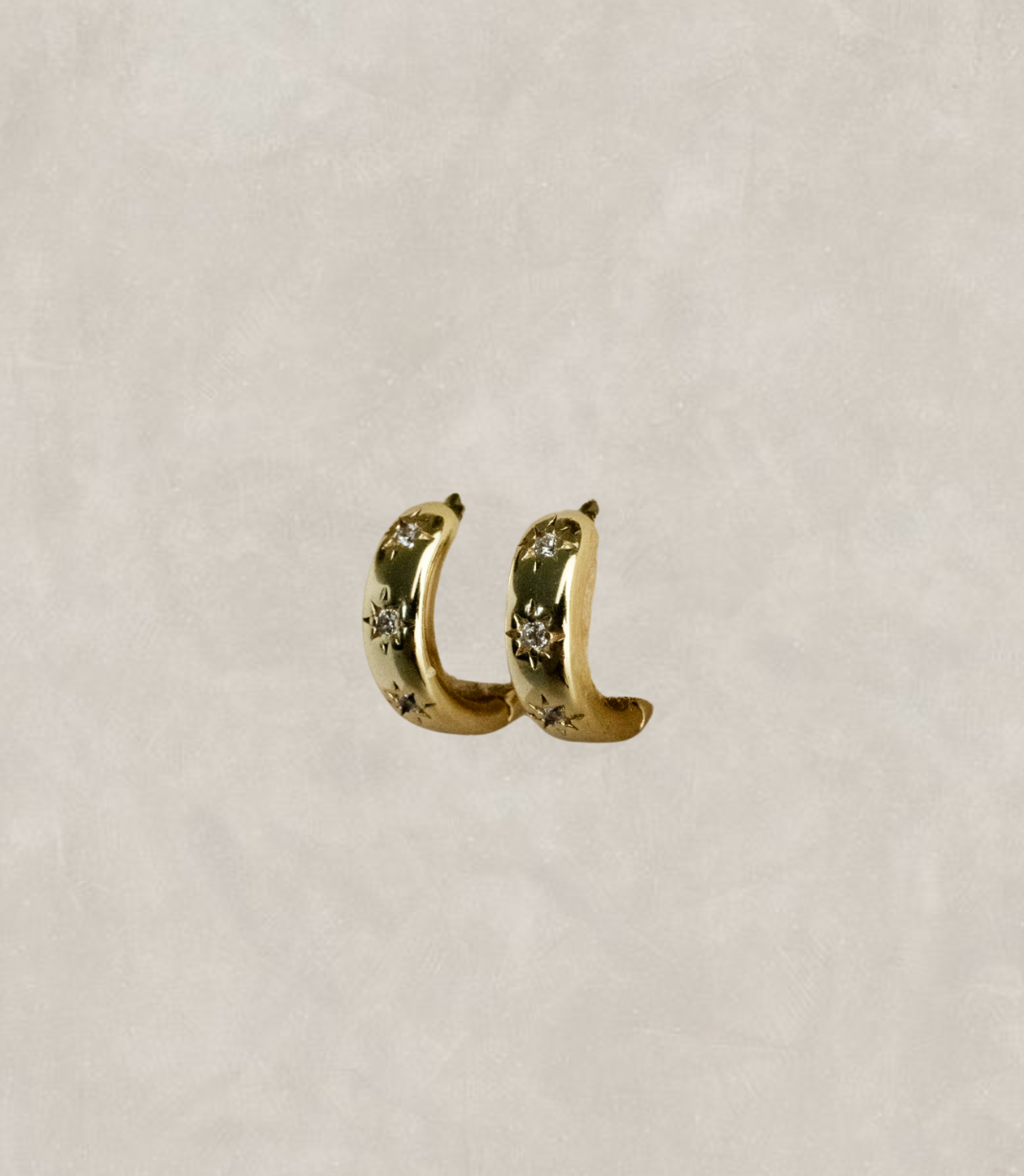 Elevate your jewelry collection with our TAHLIA Gold Hoop Earrings. Crafted from high-quality 14k gold (1 micron on sterling silver base), these striking earrings feature three sparkling cubic zirconia stones, each elegantly set against a sunburst design.
