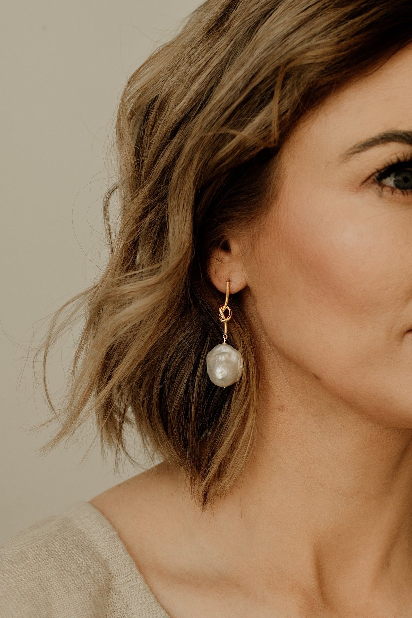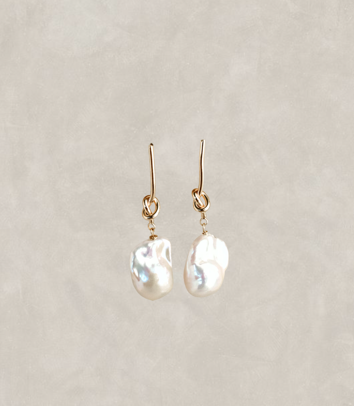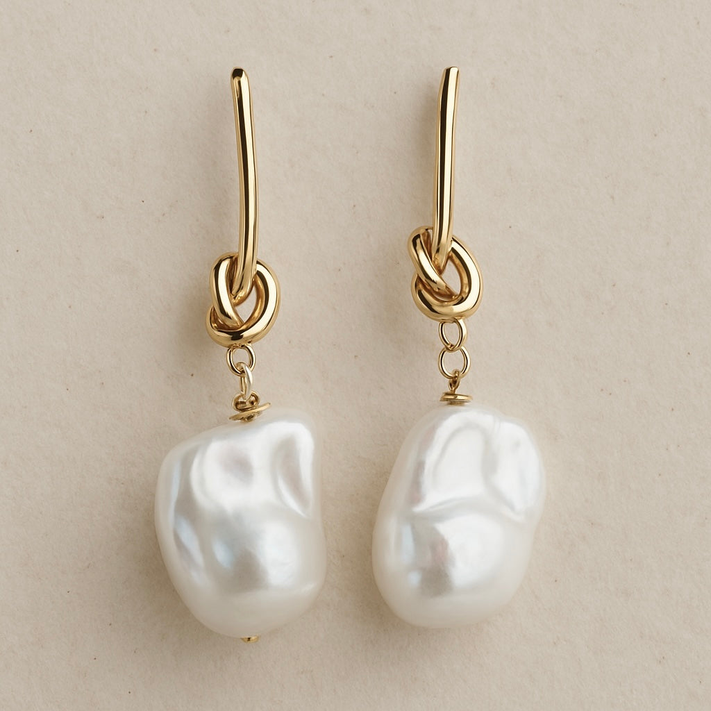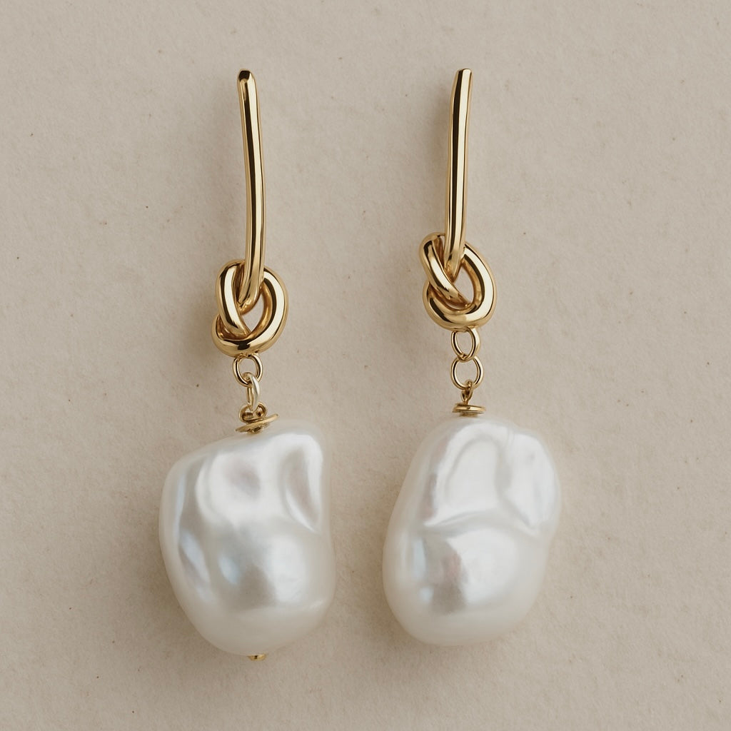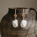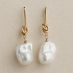 Trinity - She is luxe and she is glam! 18k gold plated long bar stud incorporating knot twist, finished with a freshwater nuclear baroque pearl drop.