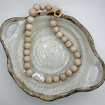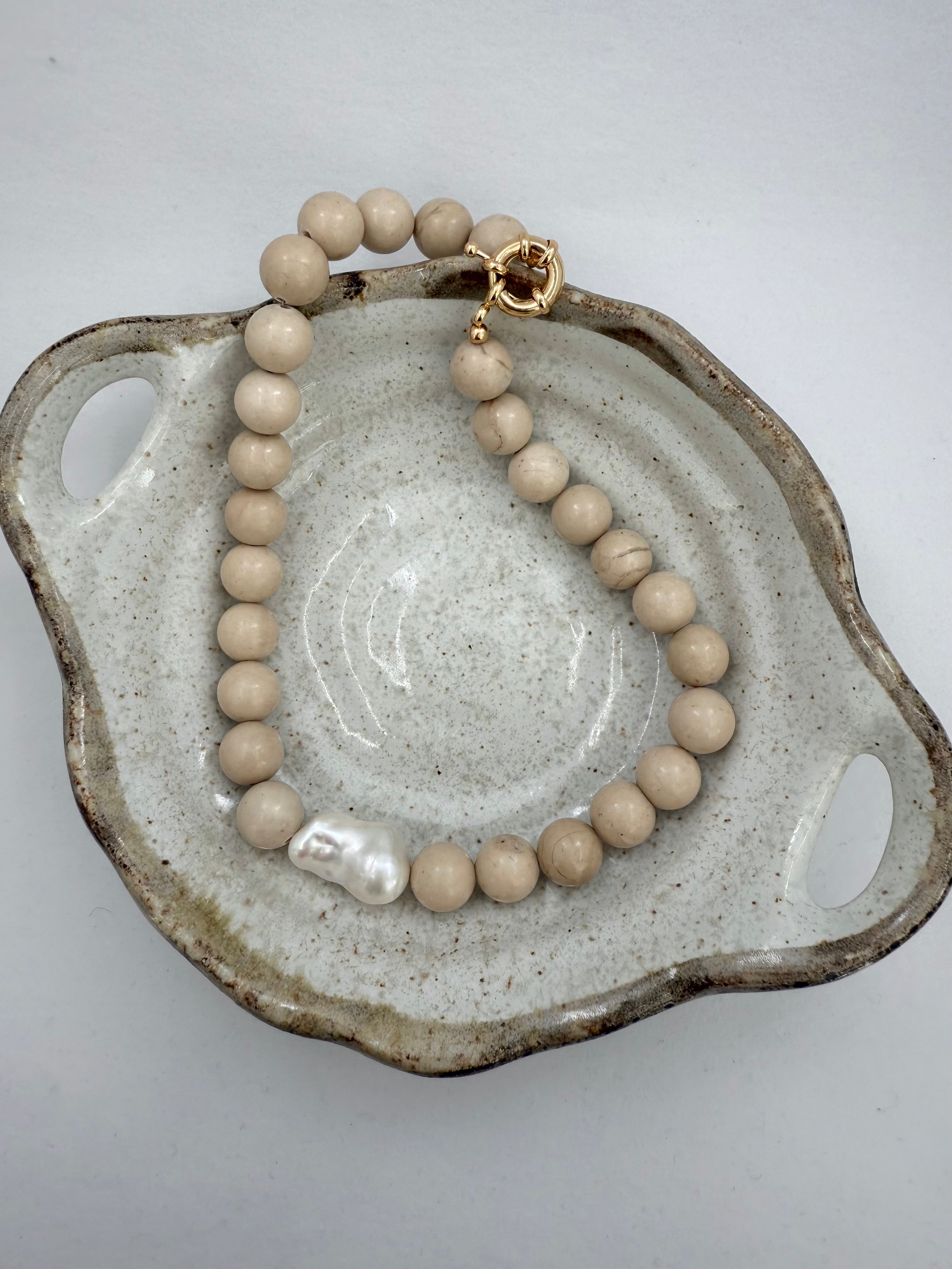Discover timeless elegance with Vale Pearl x stone necklace featuring cashmere toned beads that capture the essence of sophistication. Each bead is meticulously hand-selected for its radiant hue, creating a harmonious and eye-catching design finished with a lustrous freshwater nuclear baroque pearl.