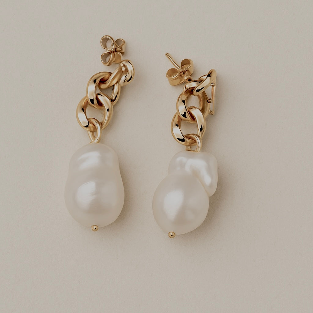 Veronica is a statement in herself comprising of 18k gold plated chain link stud, featuring large freshwater baroque pearl drop. She packs a punch! Approx drop of this piece is 4.5cm.