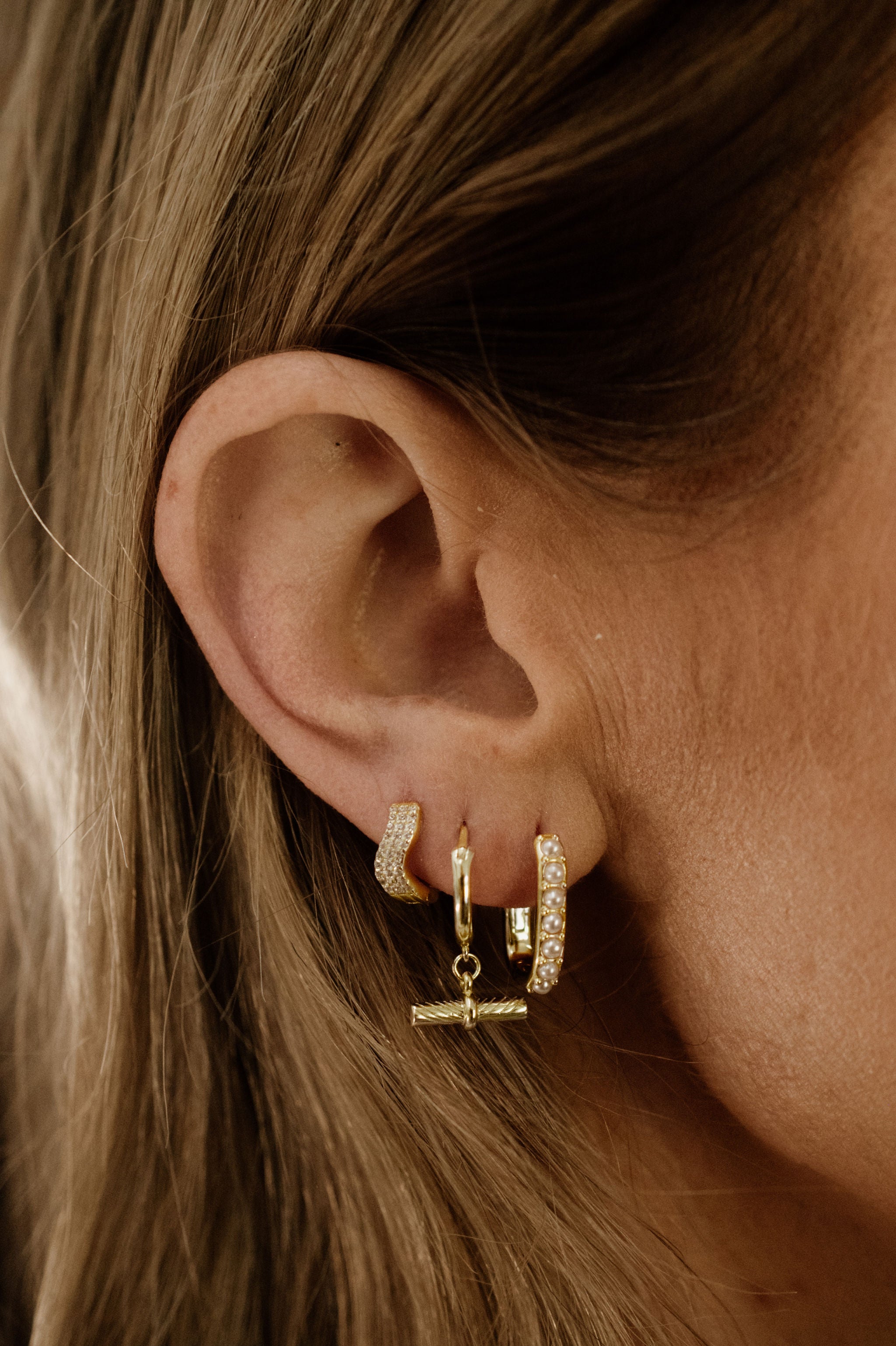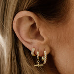 Elevate your accessory collection with our stunning Wren Gold Hoop and Bar Earrings. Expertly crafted from high-quality, hypoallergenic materials, these elegant earrings feature a classic hoop design complemented by a chic, textured bar drop.