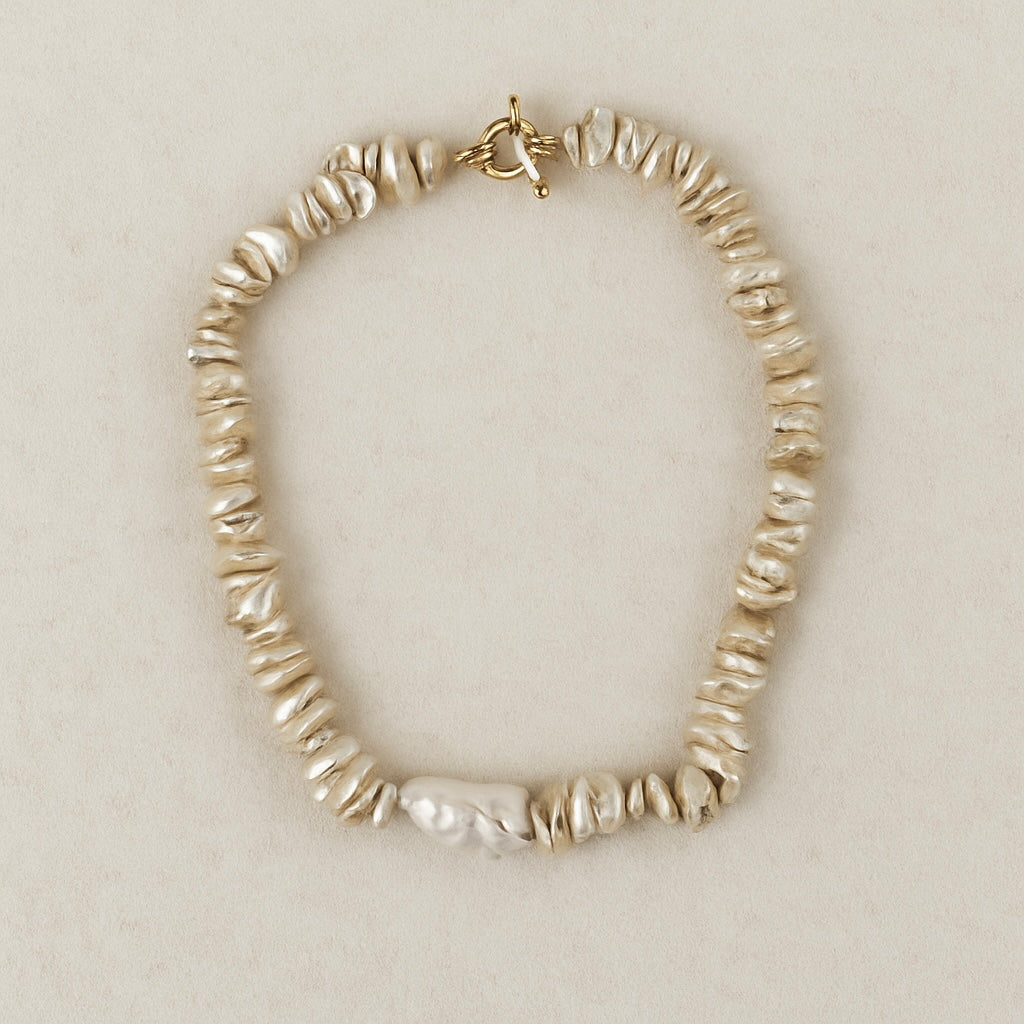 Elevate your style with our Yvonne Petal Pearl Necklace, a stunning piece that captures the essence of natural beauty and elegance. This necklace is crafted with uniquely shaped Keshi petal pearls along side a nuclear baroque Pearl, each one radiating a soft, lustrous glow that captivates the eye.